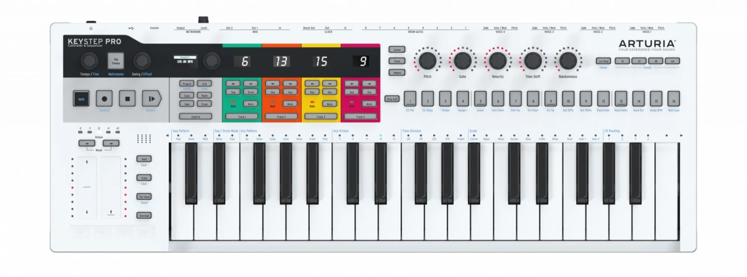 KeyStep Pro gives musicians incredible sequencing and performance power in a compact, versatile controller with 37 slim keys. Letting you fully articulate your musical ideas, this expressive little sequencer truly puts the power at your fingertips. Control and animate your instruments the way you truly want to, it removes the barriers between you and the music you want to create. Unlock your potential Take full control of your modular rigs, outboard synths, and software studio all at the same time. 4 independent polyphonic sequencer tracks, a 16-part integrated drum sequencer, intuitive controls that make even complex performances a breeze, and unparalleled connectivity. If you prefer keys to pads, you’re in for a treat. KeyStep Pro features a great-feeling 3 octave keyboard with velocity sensitivity and aftertouch: 37 slim keys with an expressive feel. Hit the stage KeyStep Pro makes gigging easy and fun, with instant and intuitive access to inspiring performance features. Multi-mode arpeggiator, randomness, easy chord mode, and real-time recording for creating on the fly. The crisp OLED displays and LED-illuminated controls will help you see it all in the dark, too! Unite your gear Your ever-growing collection of boutique modular gear, vintage synths, and software instruments can finally perform in unison, thanks to the jaw-dropping connectivity KeyStep Pro has to offer. 4 CV, Gate and Mod outputs, 8 dedicated drum Gate outputs, Clocks, MIDI in, 2 MIDI outs, a solo metronome output, sustain input to let you get expressive with your performance, and USB for easy power and DAW/softsynth control. Sequencing genius If you prefer to create music “in the box”, KeyStep Pro can also help your creativity come alive. Easily sequence and arpeggiate your virtual instruments, sync it with your software studio, and switch to the dedicated Control mode to control parameters in your favorite synths and effects. The possibilities are limitless.