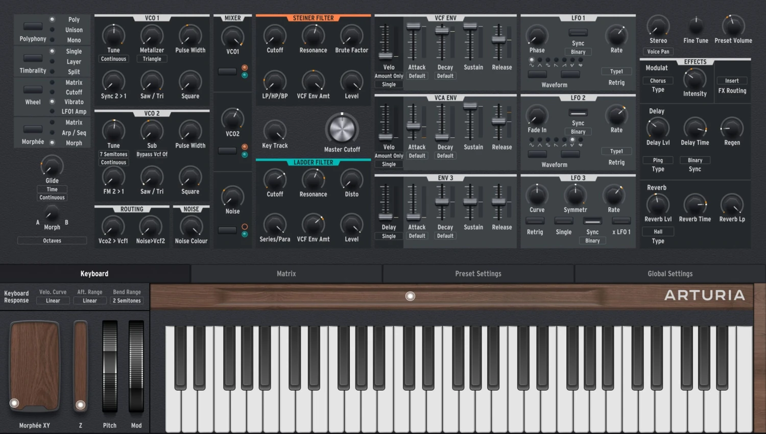 - Dual filter design: Steiner multimode and Dr. Bob Moog’s 24db Ladder