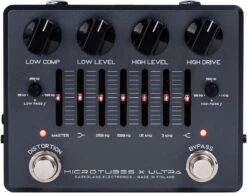 The Microtubes X Ultra greatly expands on the already immense versatility of the Microtubes X7. Featuring all the great controls that its predecessor has that allows users to select exactly what frequencies they want to compress and saturate for the low and treble respectively, but with four major additions providing an additional layer of flexibility, while maintaining the same compact footprint, making it an extremely complete tool for the modern bassist.