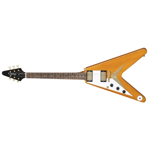 1958 Korina Flying V (White Pickguard), Aged Natural Made in partnership with the Gibson™ Custom Shop, the Limited Edition 1958 Flying V™ is Epiphone’s impressive recreation of one of the most famous and valuable vintage guitars ever made. It brings authentic 1958 Flying V details to guitarists everywhere at a breakthrough price. Like the ultra-rare original Gibson models from 1958, it features a Karina body and a Karina neck with a long neck tenon and a 1958 Flying V neck profile. It is also equipped with an Indian laurel fretboard and gold hardware. The electronics are also top-notch, with Gibson Burstbucker™ 2 and Burstbucker 3 pickups wired to individual volume controls and a master tone control with CTS® pots and a Mallory capacitor, along with a Switch craft® 3-way pickup selector switch and 1/4″ output jack. An Epiphone x Gibson Custom logo on the back of the headstock is also proudly displayed, and a hardshell case is also included