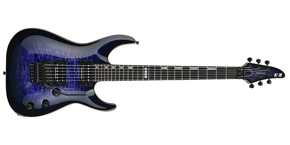 Created at the ESP facility in Tokyo, Japan, the ESP E-II Series is our highest-quality factory-produced instrument collection. The ESP E-II Horizon FR is a guitar designed for high-level performing, for serious players who can’t accept compromises in their instrument’s ability to showcase their talent. It offers set-thru construction for fast and smooth access to the highest frets, pairing a mahogany body to a three-piece maple neck with ebony fingerboard and 24 extra-jumbo frets. You’ll appreciate the feel of fine, detailed workmanship each time you pick up the E-II Horizon FR, which includes high-end components like a Floyd Rose Original bridge, Schaller straplocks, Gotoh locking tuners, and more. This guitar offers some of the best-sounding and responsive passive pickups available, with the Seymour Duncan Jazz (neck) and Seymour Duncan Custom 5 (bridge) pickups that provide a world of tone for almost any genre of music from metal to fusion. The E-II Horizon FR is available in ESP’s famous Reindeer Blue finish with a beautiful quilted maple top, or in solid Black finish.