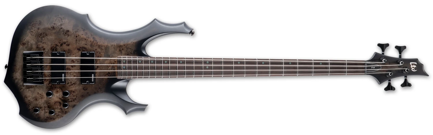 With its menacing sculpted and contoured body, the LTD F Series has long been a favorite for bass players of the heaviest music styles. With the F-4 Ebony and 5-string F-5 Ebony, bass players have an affordable choice for a super high-quality bass that’s ready to rock. It offers neck-thru-body construction at 35” scale, making it excellent for maintaining string tension while downtuning. The seven-piece maple / mahogany neck is extra-thin U-shaped for great playing comfort, and its mahogany body is topped with figured burled poplar. Its ebony fingerboard offers 24 extra-jumbo frets and offset abalone dot inlays. Other features on this bass include a string-thru-body bridge and a set of ESP Designed SB-4N and SB-4B active pickups (SB-5 on the 5-string version), with volume, balance, a ABQ-3 3-band EQ controls.