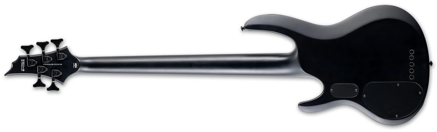 With its menacing sculpted and contoured body, the LTD F Series has long been a favorite for bass players of the heaviest music styles. With the F-4 Ebony and 5-string F-5 Ebony, bass players have an affordable choice for a super high-quality bass that’s ready to rock. It offers neck-thru-body construction at 35” scale, making it excellent for maintaining string tension while downtuning. The seven-piece maple / mahogany neck is extra-thin U-shaped for great playing comfort, and its mahogany body is topped with figured burled poplar. Its ebony fingerboard offers 24 extra-jumbo frets and offset abalone dot inlays. Other features on this bass include a string-thru-body bridge and a set of ESP Designed SB-4N and SB-4B active pickups (SB-5 on the 5-string version), with volume, balance, a ABQ-3 3-band EQ controls.