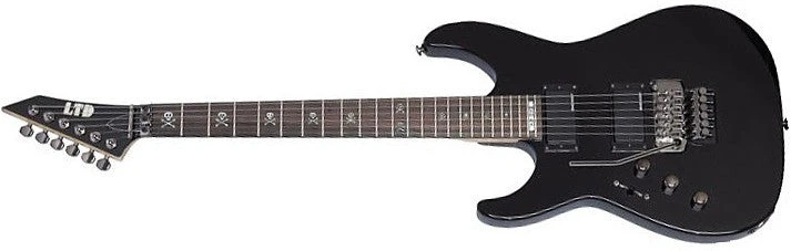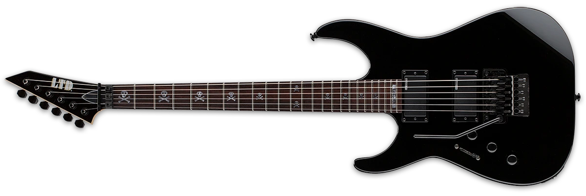 Nothing screams hard rock like ESP’s high-mass double-cutaway design, which gives the KH-202LH incredible sustain and bite. Designed to resemble Kirk’s original ESP without the road wear, its deep black finish sets off the iconic skull and crossbones inlays on the rosewood fingerboard. The dual ESP-designed extreme-gain humbuckers put out tons of confrontational tone with a 3-way pickup selector that lets you explore a vast tonal range. And a true Floyd Rose tremolo lets you pull off deep dive-bombs that always return to pitch.