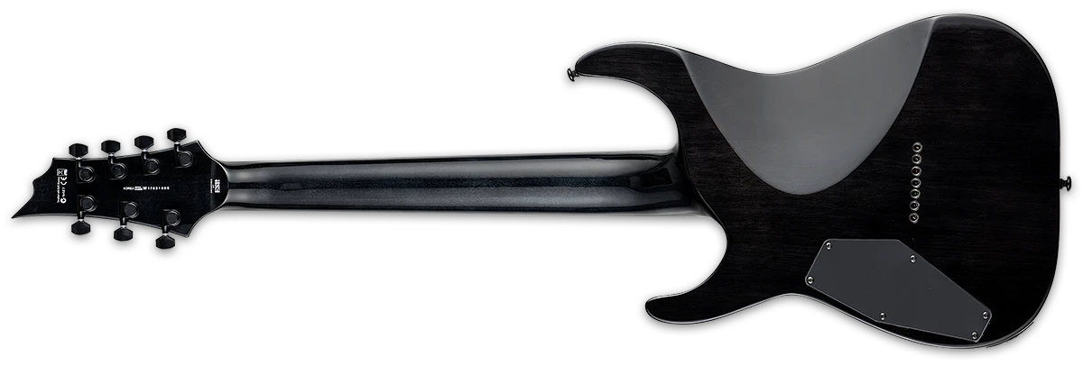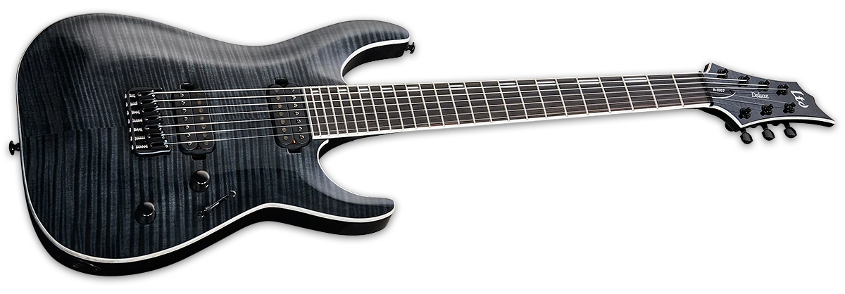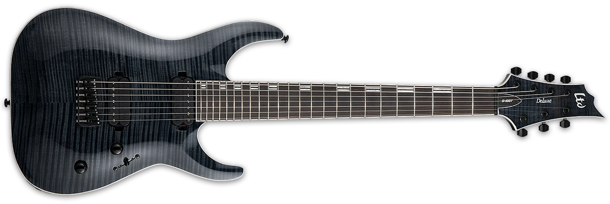 Guitars in the LTD 1000 Series are designed to offer the tone, feel, looks, and quality that working professional musicians need in an instrument. The H-1007FM is a seven-string guitar that offers high-end playability along with the extended range of an additional string to broaden your low-end horizons. It also includes high-end components like LTD locking tuners and a Hipshot bridge with string-thru-body design, as well as Seymour Duncan pickups that are direct-mounted. Its mahogany body and flamed maple top are accented with body/neck/headstock binding, as well as a set-thru three-piece maple neck, and a Macassar ebony fingerboard with 24 XJ frets. Excellent for metal, rock, progressive, blues, fusion, or any kind of music where you want to stand out from the crowd. Available in See Thru Black finish.
