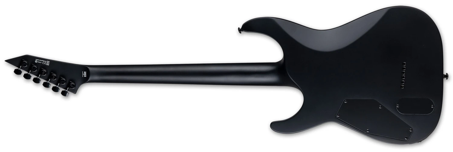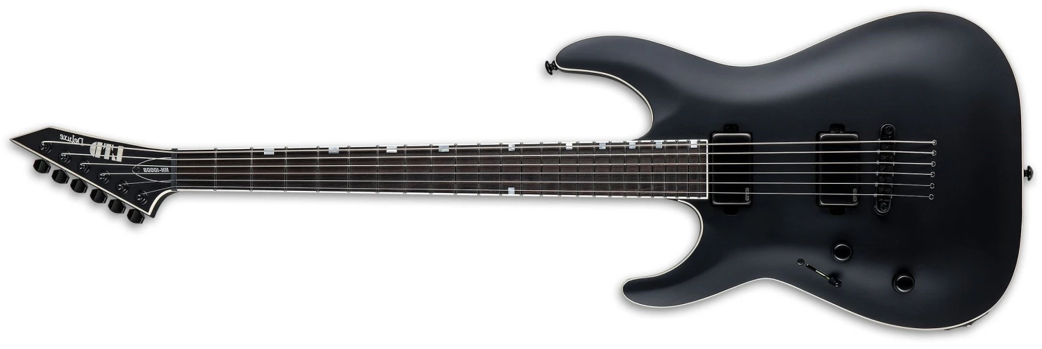 Guitars in the LTD 1000 Series are designed to offer the tone, feel, looks, and quality that working professional musicians need in an instrument. The MH-1000 Baritone is designed to handle the extended lower range of modern metal and progressive rock with its 27” scale and typical tuning a fourth below standard (B-E-A-D-F#-B) while still retaining ideal string tension and tone. This monster guitar offers neck-thru-body construction for stability and sustain, using an arched mahogany body with maple cap, and an extra-thin three-piece maple neck. its design includes a compound neck radius for maximum speed and comfort. Its Macassar ebony fingerboard features 24 extra jumbo stainless steel frets and offset white pearloid block inlays. White binding on the body, neck and headstock helps define this guitar’s sleek shape. Components on the MH-1000 Baritone include LTD locking tuners, a TonePros locking TOM bridge with string-thru-body, and direct-mount EMG 81 and EMG 60TW-R pickup with coil splitting and brushed black chrome covers.