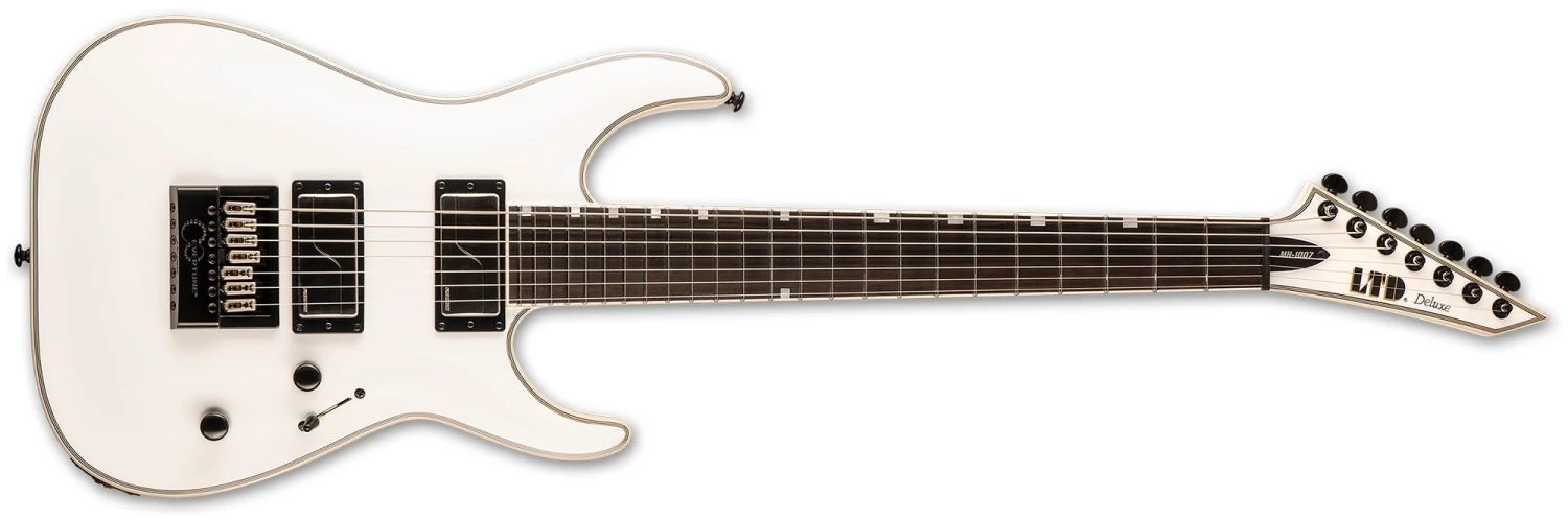 LTD Deluxe guitars are designed to offer the tone, feel, looks, and quality that working professional musicians require in an instrument, while remaining affordable enough for serious players. The LTD MH-1007 EverTune Snow White is a 7-string guitar that features the EverTune constant tension bridge, keeping your guitar in tune at all points of the fingerboard in nearly any environment. It offers set-thru construction of a mahogany body with maple cap, and multi-binding on the body, neck, and matching-finish headstock. Its Macassar ebony fingerboard has 24 extra-jumbo stainless steel frets. The MH-1007 Snow White also includes Grover tuners, and a set of Fishman Fluence Modern Humbucker pickups (alnico in the neck position, ceramic in the bridge). These versatile active pickups can produce a variety of great tones, with multiple voicings selectable via a push-pull control.