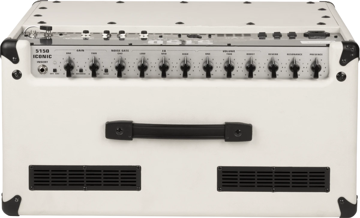 Sporting sophisticated and distinctive EVH style, the 5150 Iconic Series 40-watt 1×12 combo is wrapped in either Black or Ivory textured vinyl with a black cloth front grille and features silver and black 5150 and EVH logo badges in the upper left and lower right corners. This all-tube combo is finished off with a brushed aluminum top panel, vintage-style chicken-head knobs and molded black plastic top handle. A high-quality fitted cover is available as an EVH Accessory.