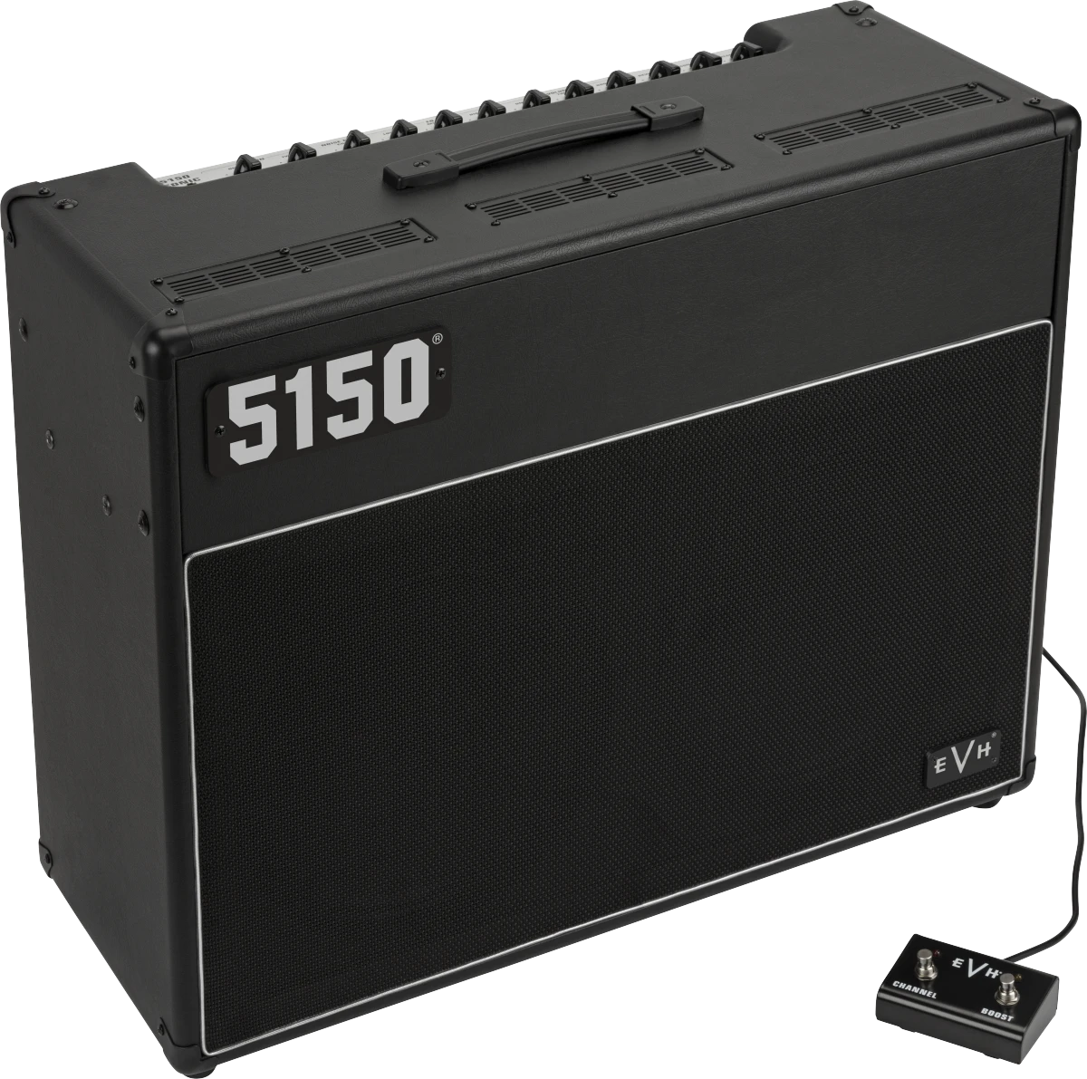 Sporting distinctive EVH style, the 5150 Iconic Series 60W 2×12 combo is wrapped in either Black or Ivory textured vinyl with a black cloth front grille and features silver and black 5150 and EVH logo badges in the upper left and lower right corners. This all-tube combo is finished off with a brushed aluminum top panel, vintage-style chicken-head knobs and molded black plastic top handle. A high-quality fitted cover is available as an EVH Accessory.