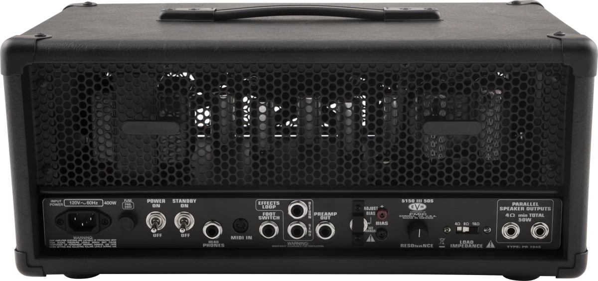 Seductively dark in black textured vinyl with a dual black EVH striped steel grille front panel, our 50-watt stealth head also comes with vintage-style “chicken head” black control knobs, red lamp jewel, dual speaker output jacks, four-button footswitch, effects loop, direct out and molded plastic handle.
