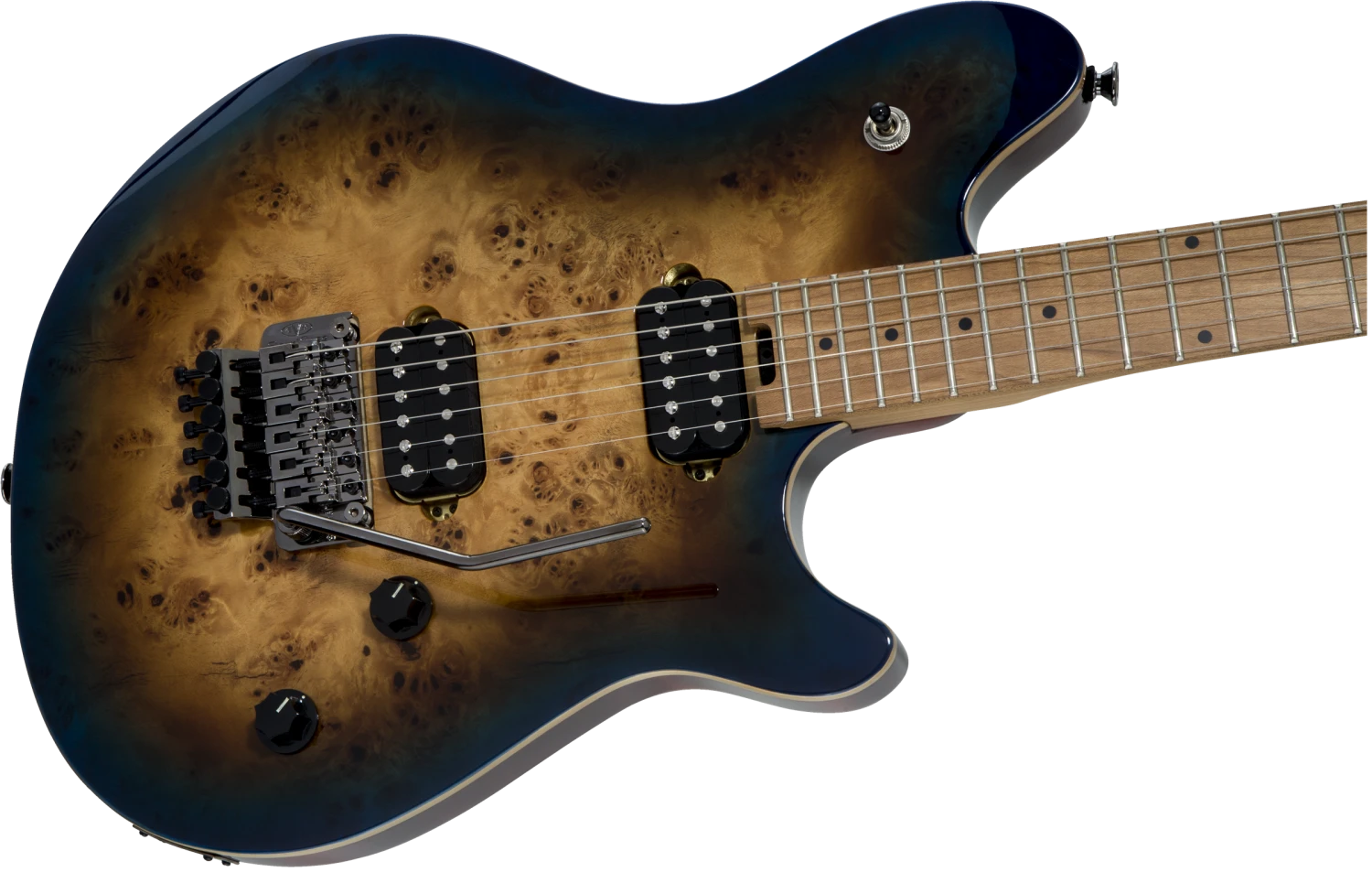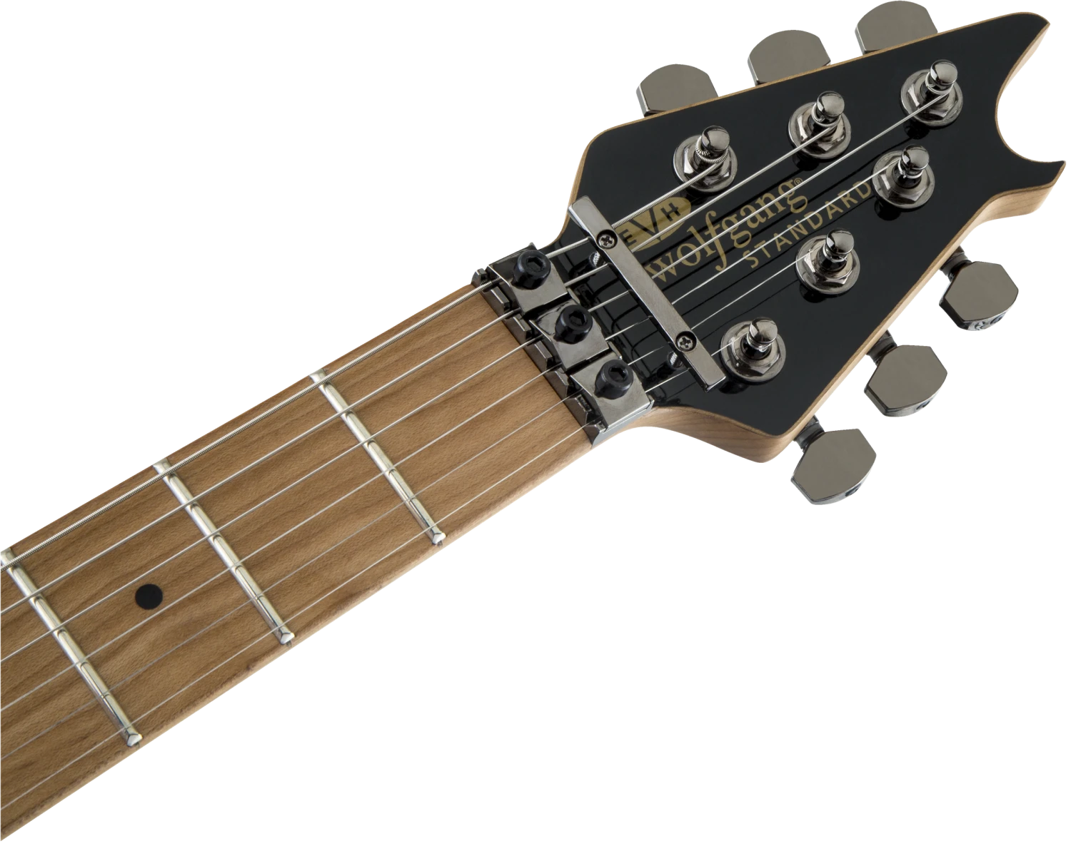 Dual EVH® Wolfgang humbucking pickups mounted directly to the body increase vibration transfer, resulting in sustain for days on end. Two domed control knobs have been dialed-in to Van Halen’s exacting specifications—the smooth-feeling 500k pots make it easy to find a unique sound while retaining the crisp high-end sparkle of the Wolfgang pickups. The EVH-branded Floyd Rose® Special bridge and R2 locking nut consistently keep the instrument in tune through the deepest whammy dives and horse whinnies.
