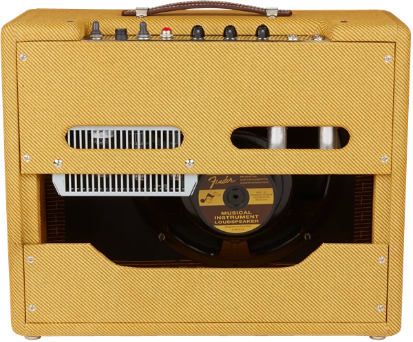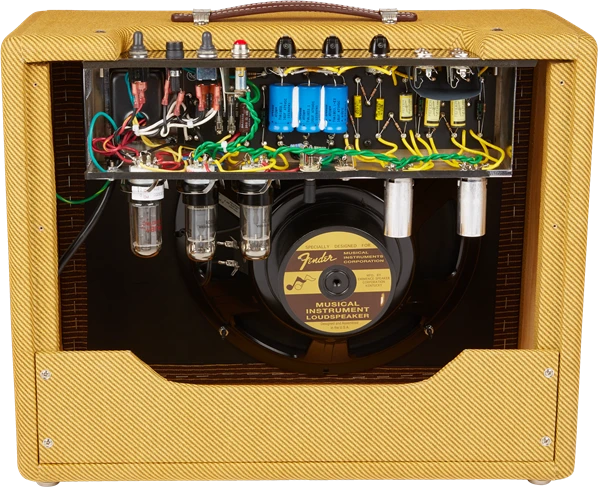 The original all-tube 5E3 circuit is renowned for its early-onset distortion and highly interactive controls—a little experimentation unlocks a world of tonal treats for your ears. The classic design is updated with improved volume pot tapers, offering more precise control at low settings used for rich, mellow clean tone from the Instrument and Mic channels. The handwired circuit includes premium yellow coupling capacitors chosen for their authentic vintage Fender tone—producing sparkly cleans and creamy overdrive with smooth top end and round mids. A newly designed single 12” 8-ohm Eminence® Special Design alnico speaker delivers these rocking vintage tones, driven by a pair of 6V6 power tubes for 12 watts of classic tube sound and a 5Y3 rectifier tube for authentic tweed touch-sensitive response.