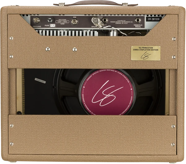 The brown ’62 Princeton amp’s sensitivity and smooth organic tremolo made it a longtime studio favorite and the ideal partner for Grammy®-winning country artist, Chris Stapleton. The hand-wired ’62 Princeton Chris Stapleton Edition combines the classic 6G2 circuit with Stapleton’s favorite features and personally chosen aesthetic touches. This 12W combo features Fender Vintage “Blue” tone caps, Schumacher™ transformers, an upgraded Eminence® 12” Special Design “CS” speaker, and an output tube-biased tremolo circuit. The acoustically resonant solid pine cabinet wears rough brown textured vinyl covering, wheat grille cloth and thick dark brown leather handle, while the dark brown control panel sports dark brown “radio” knobs and the rear panel features an engraved brass plate with Chris Stapleton artwork. Includes 1-button switch for tremolo and retro-styled Filson™ Rugged Twill fabric cover.