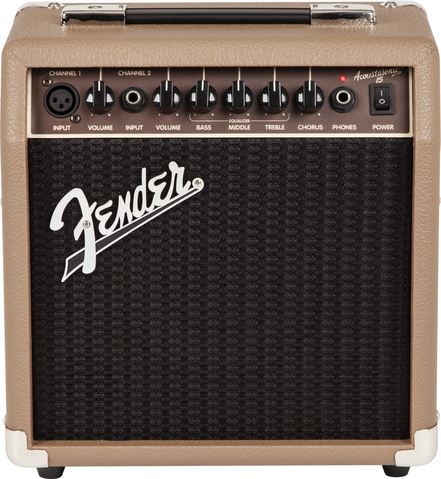 The Fender Acoustasonic 15 portable amplifier offers exemplary portable amplification for acoustic-electric guitar and a vocal microphone, with enough simplicity and flexibility for a variety of musical performance and basic public address uses.