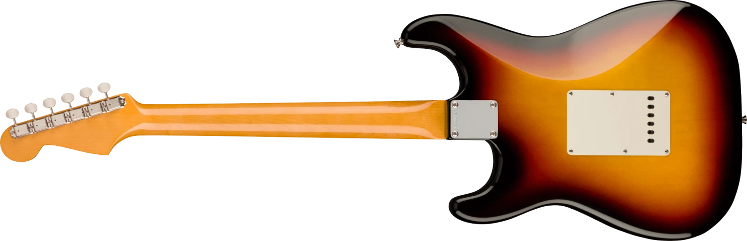 During the late ‘50s and early ‘60s, the popularity of Fender musical instruments flourished, and although the Fender assortment had expanded to include many great new instruments, the Stratocaster® reigned supreme. By 1961, the Stratocaster had taken on a more refined aesthetic, with a 3-Color Sunburst reformulated with a more vibrant red and bolder black edge, topped with a 3-ply pickguard accenting the Strat’s signature curves.