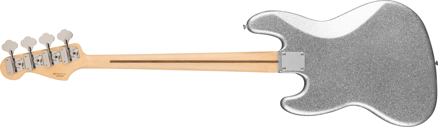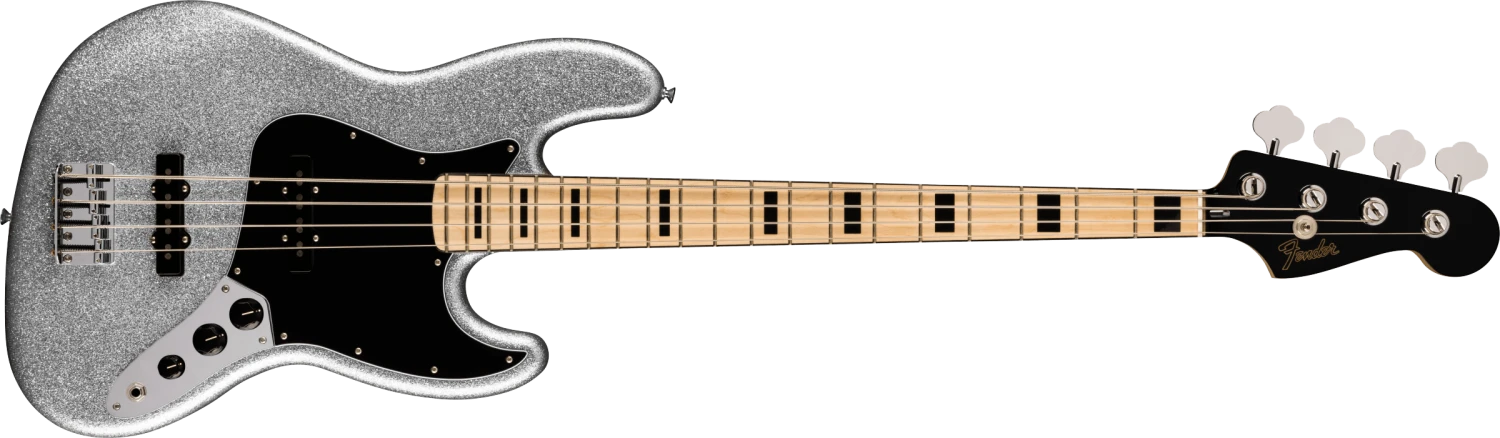 Featuring an alder body finished in dazzling silver sparkle and a sleek maple neck with black binding, block inlays and gloss black painted headstock, this bass is sure to turn heads. Boasting more than show-stopping looks, the Mikey Way Jazz Bass is built for maximum punch and versatility. A powerful pair of vintage-style ’70s single-coil Jazz Bass pickups deliver the classic sound that defined an epic era of rock. The ’70s “C”-shaped maple neck is comfortable and easy to maneuver for speedy riffs and high-octane gigs. Other features include a vintage-style 4-saddle bridge, ’70s style “Fender” stamped tuners, “Bullet” style truss rod nut and Mikey’s signature on the back of the headstock.