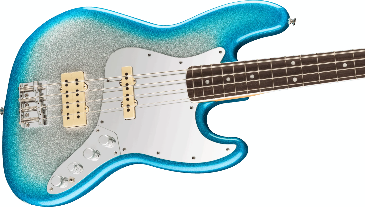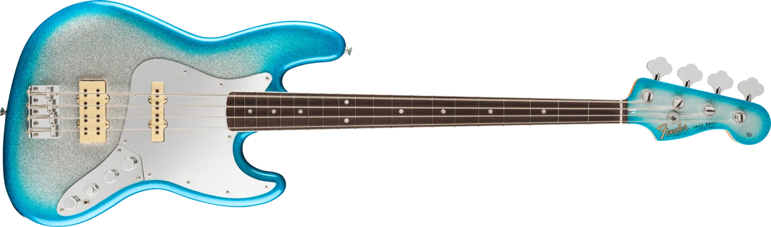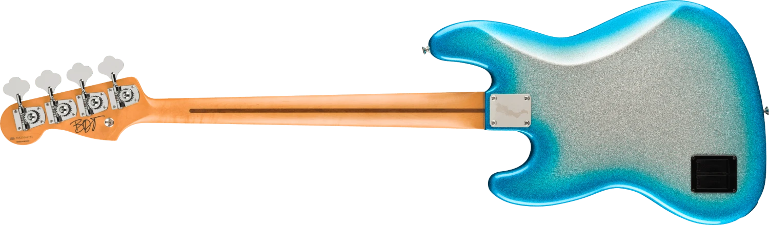From the dazzling Sky Burst Sparkle to the gleaming chrome hardware and mirrored pickguard, every detail on this Jazz Bass echoes Blu’s bold artistic vision. The offset ash body is chambered to keep this bass as lightweight and comfortable as possible. The satin finished maple neck, bound 9.5” rosewood fingerboard and vintage tall frets provide smooth playability. The Custom Blu DeTiger Fireball® bass humbucker and Player Plus Noiseless™ Jazz Bass Pickups fuse vintage charm with modern punch. The bass also includes an 18V Player Plus preamp with 3-band EQ and active/passive toggle, great for sculpting your tone and ideal for capturing the funky snap and growl that defines Blu’s sound.