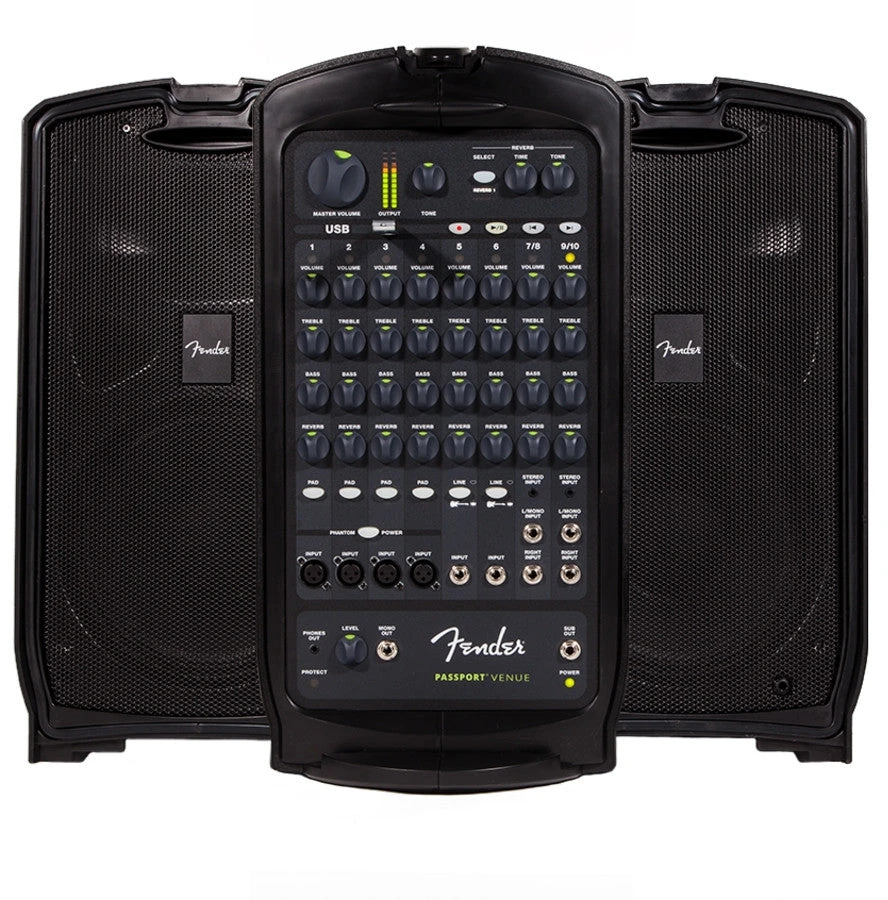 The Fender Passport VENUE is a self-contained portable audio system that includes everything you need for great sound anywhere you go. Carry your Passport as you would a suitcase, and simply flip open the cabinet release latches when you’re ready to set it up. Inside you’ll discover two full-range speaker cabinets, a powered mixer and all the cables you’ll need to get started.