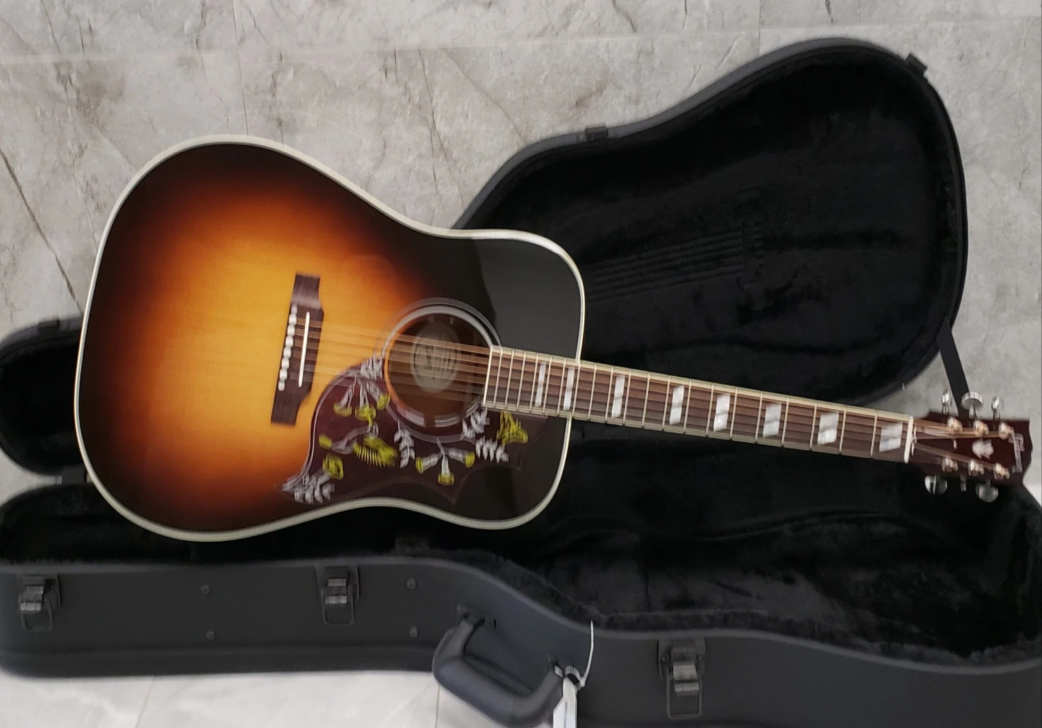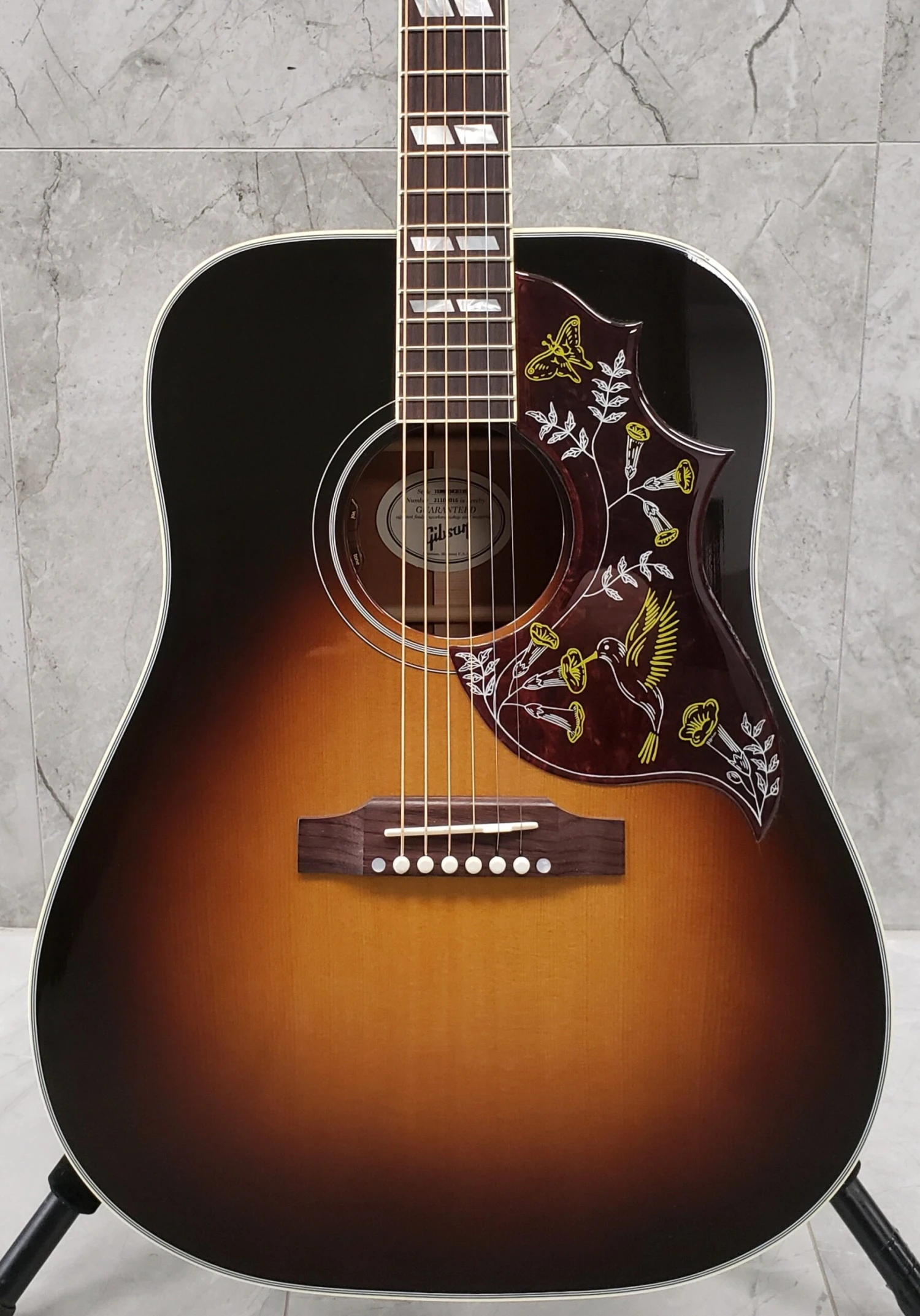 Much of the Hummingbird’s appeal lies in its versatility. No matter how you attack this flat-top, it pumps out rich, deep tones, and is equally at home strumming first-position chords as it is taking the spotlight for picking lead lines. Its spacious mahogany body and sweet, select Sitka spruce top are more than capable of nailing down the rhythm in the hands of a rock and roll sideman or accompanying the most nuanced performance under the fingers of todays alternative singer-songwriter. The Hummingbird’s mahogany neck has a comfortable rounded profile and mother of pearl parallelogram inlays. This ‘bird has a TUSQ® nut, saddle, and bridge pins, Grover® Rotomatic® tuners, the iconic Hummingbird graphics on the pickguard, and is equipped with LR Baggs® VTC electronics, so it’s ready to plug in on stage or in the studio. A Gibson hardshell case is included.