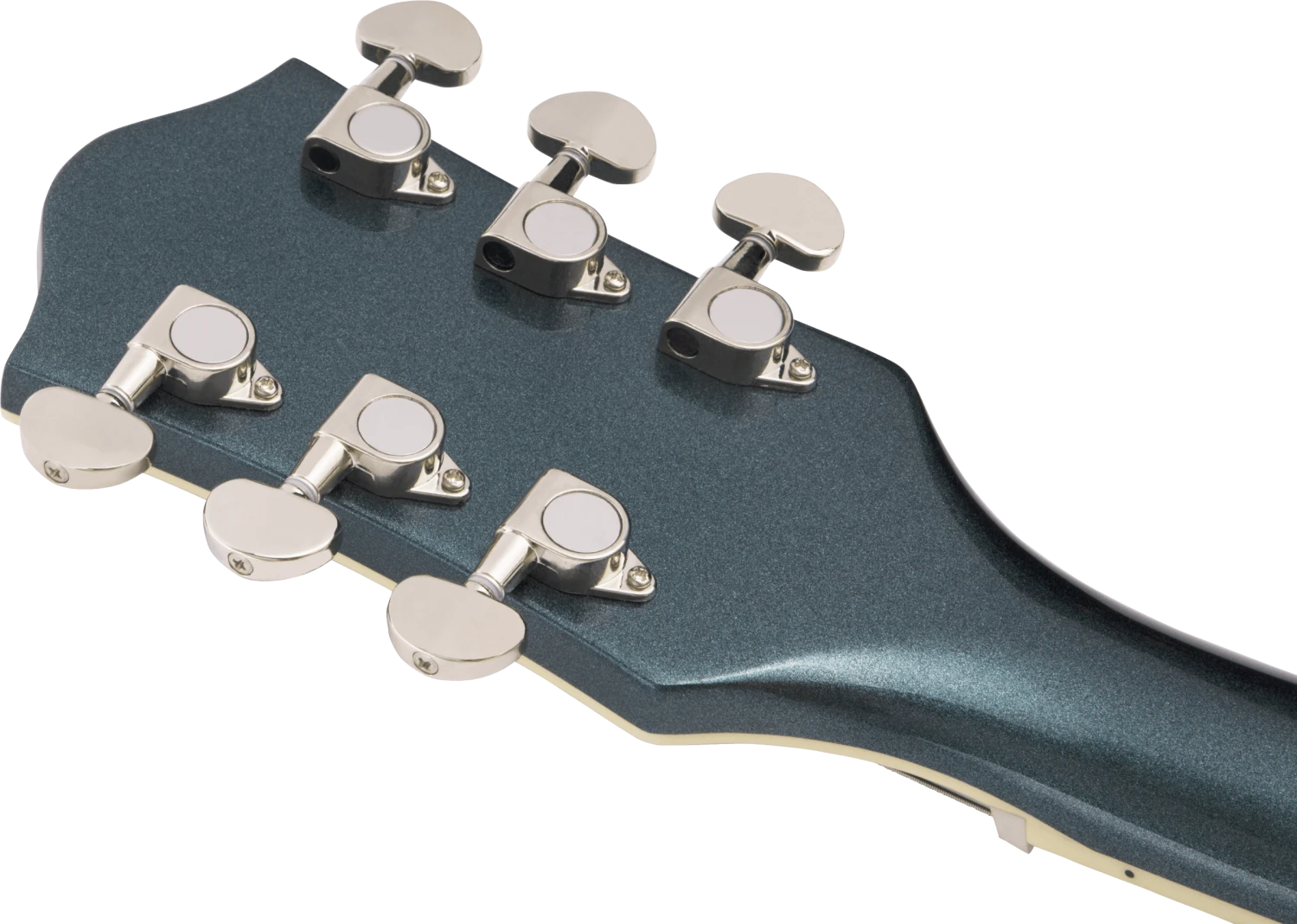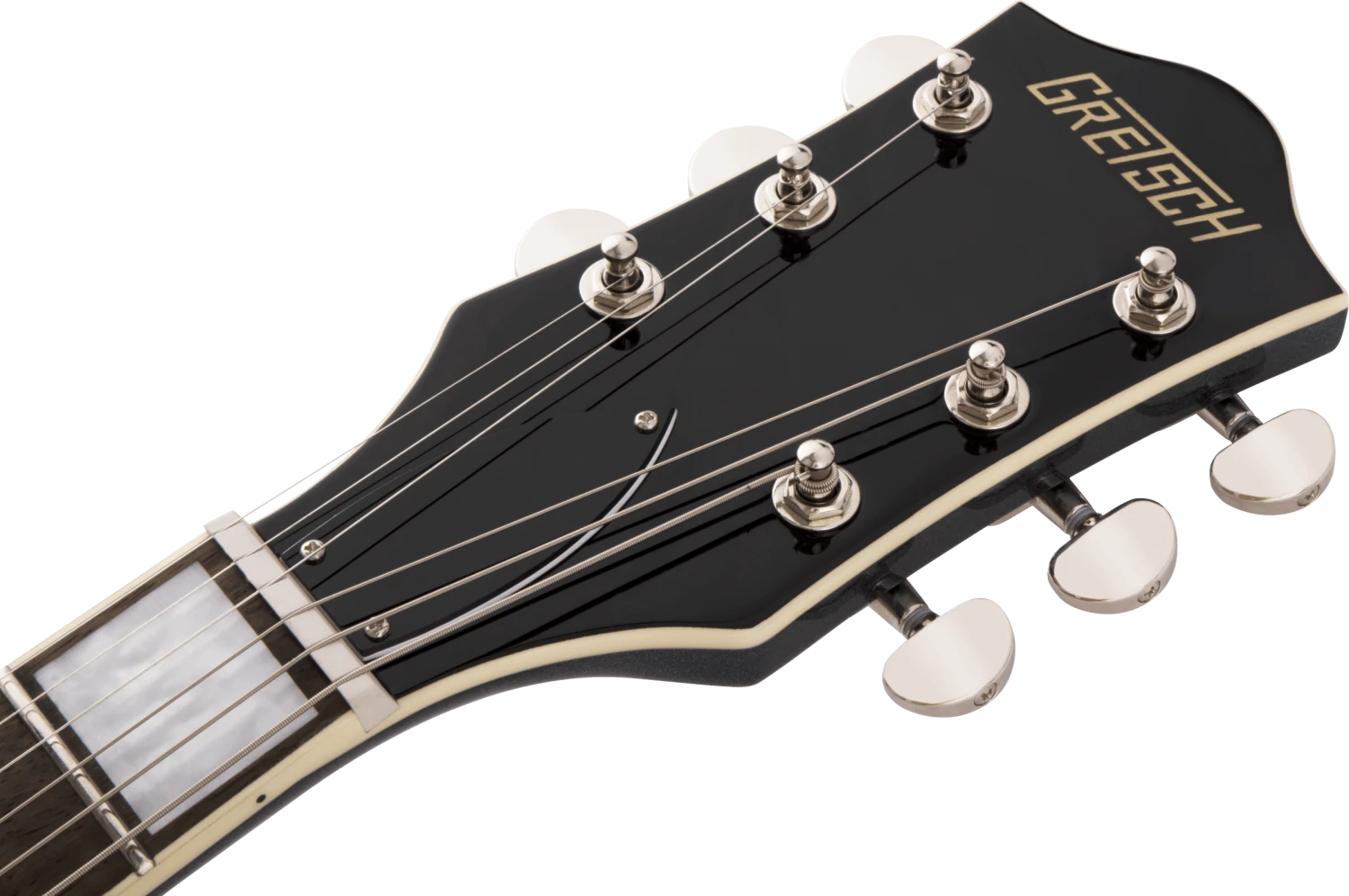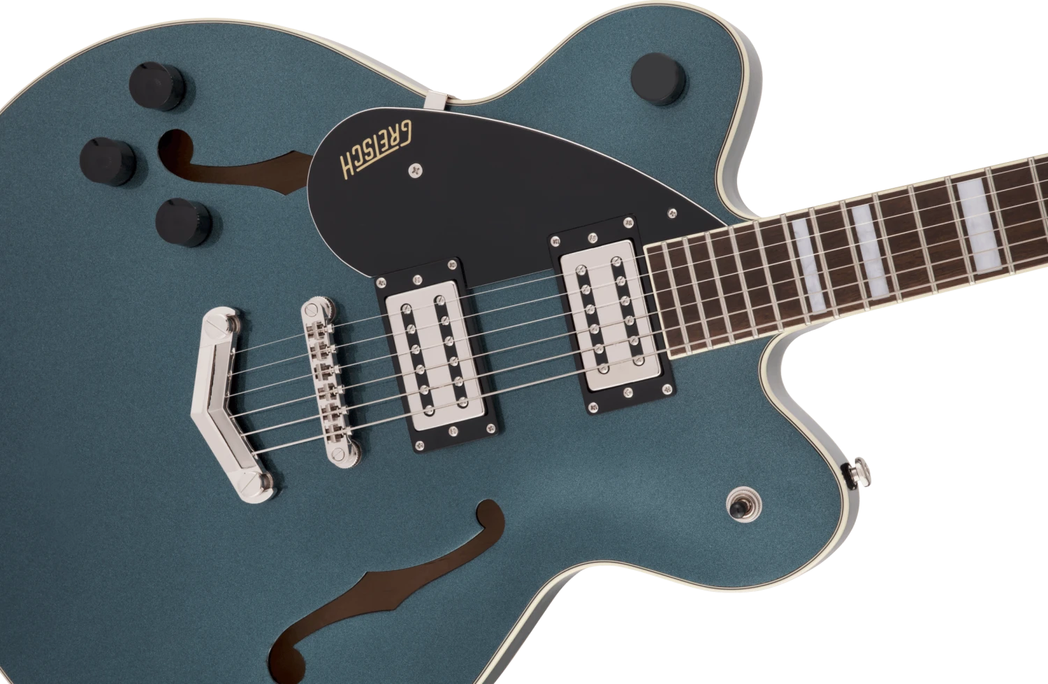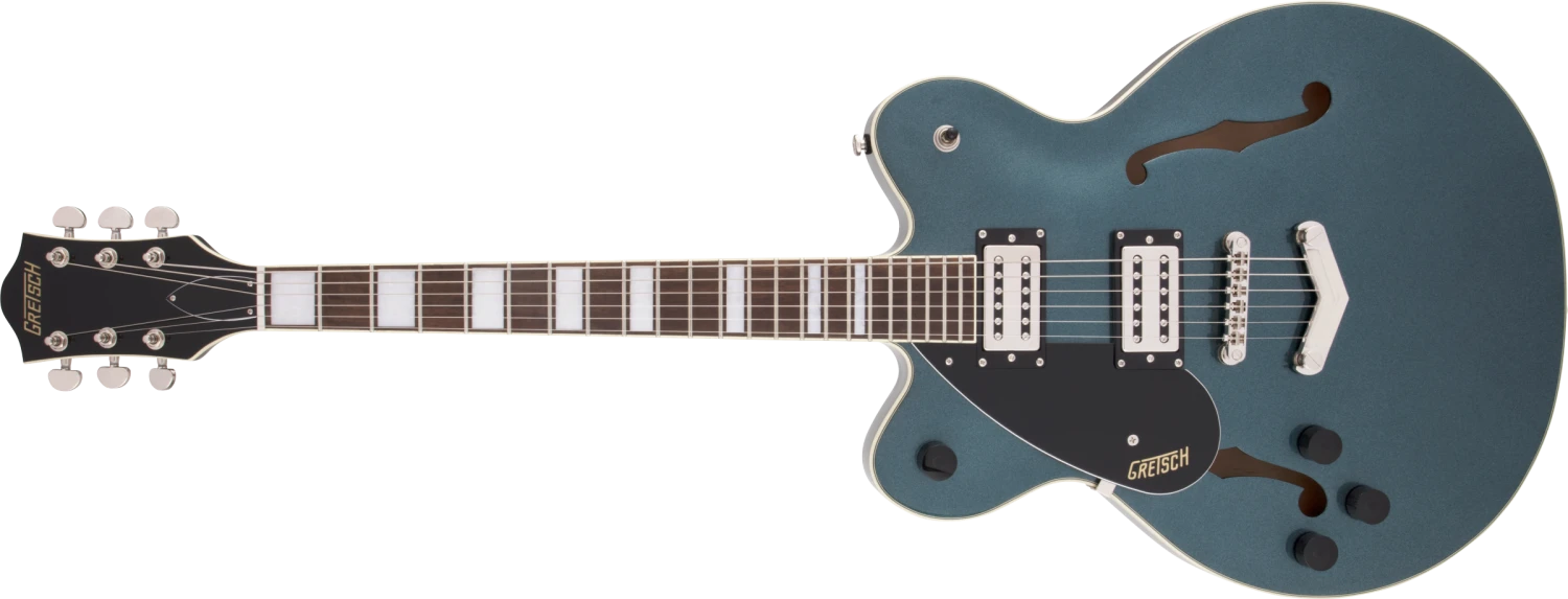 The secret to the Streamliner’s sound is twofold—the Broad’Tron™ BT-2S humbucking pickup and the spruce center block. Designed specifically for the Streamliner Collection, the high-output Broad’Tron pickup spawns improved definition with tighter bass response for robust lows, pristine highs and a throaty midrange. A lightweight spruce center block runs the length of the body, reinforcing the top while eliminating undesired feedback for volume-friendly performance on rocking stages. The Streamliner’s sonic power is harnessed and shaped by the traditional control layout—neck and bridge pickup volume controls, a master tone control, master volume control and three-way pickup switching. A fast-playing 12”-radius laurel fingerboard with elegant pearloid Big Block inlays and 22 medium jumbo frets sits atop the white-bound neck with a thin “U”-shaped profile—ideal for chord work or fiery riffing. Enjoy rock-solid tuning stability courtesy of the stylish Gretsch V-Stoptail tailpiece, anchored Adjusto-Matic™ bridge and synthetic bone nut.