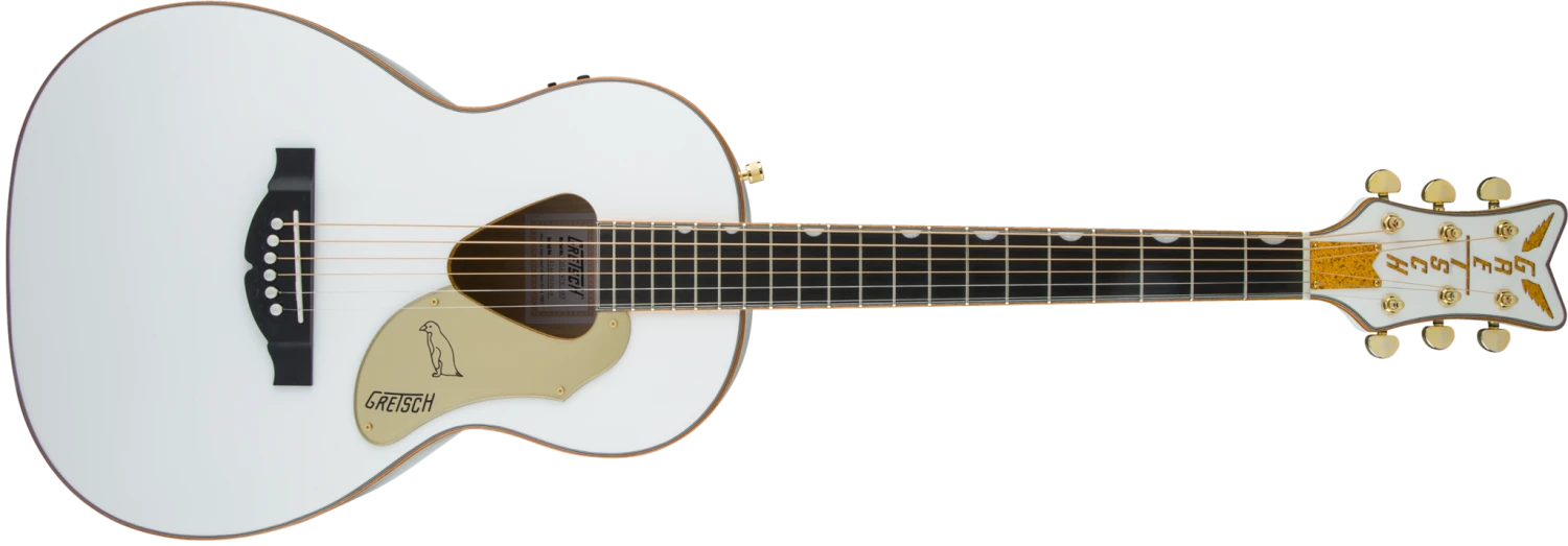Surely one of the most fabulous Gretsch birds ever to take flight, the G5021WPE Rancher™ Penguin™ Parlor Acoustic/Electric delivers classic Penguin style and appointments in a richly resonant parlor-size acoustic guitar. The Fishman® Isys III pickup/preamp system provides a modern sonic complement to classic touches including a solid spruce top with maple back and sides, gold sparkle neck and body binding, Neo-Classic™ “thumbnail” fingerboard inlays, a gold plexi pickguard,