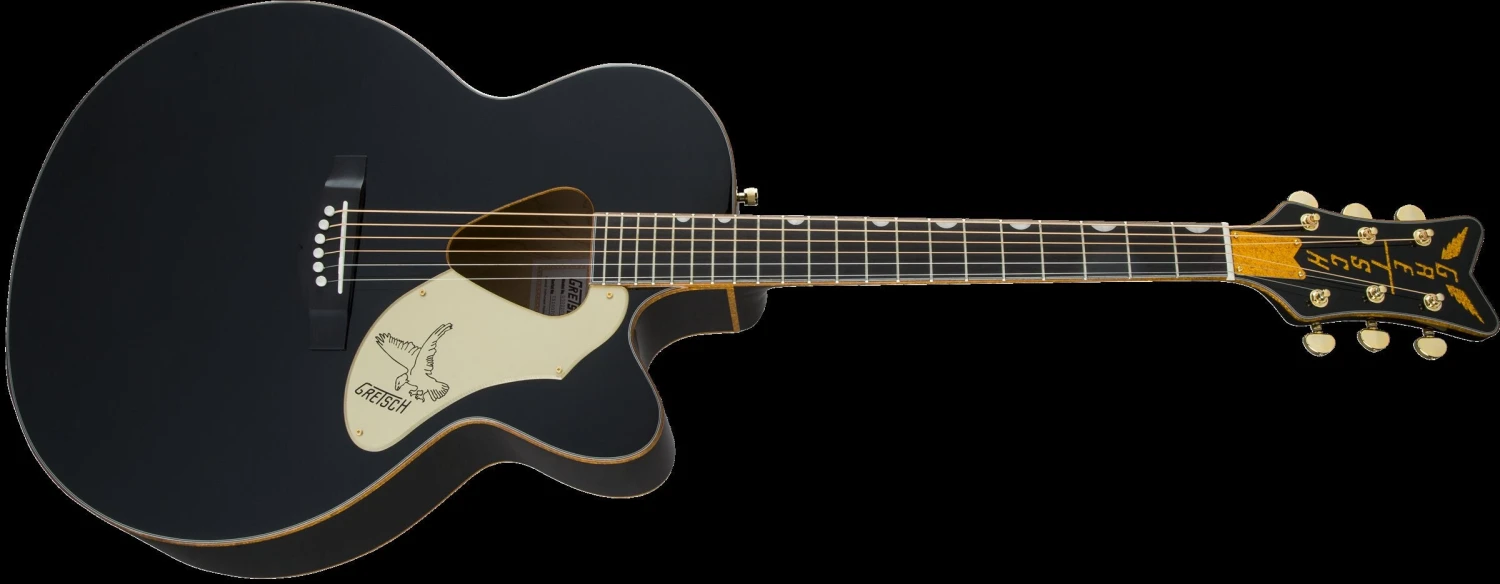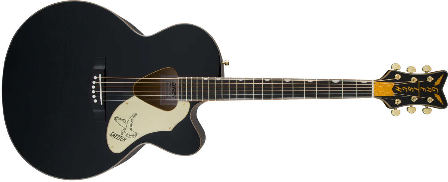 Its jumbo cutaway body includes dazzling gold-sparkle binding on the top, back, sound hole, fingerboard and headstock. Other premium features include a solid spruce top with scalloped “X”-bracing and classic Rancher triangular sound hole, maple sides and arched back, mahogany neck, 21-fret rosewood fingerboard with Neo-Classic™ “thumbnail” inlays, “V”-shaped headstock with vertical winged “Gretsch” sparkle logo, compensated bridge with rosewood base, deluxe tuners, and gold-plated hardware. The Fishman® Sonicore under-saddle pickup and Isys+ preamp system provide great amplified performance and flexible sonic control, with volume, tone and phase controls, onboard tuner and battery life indicator.