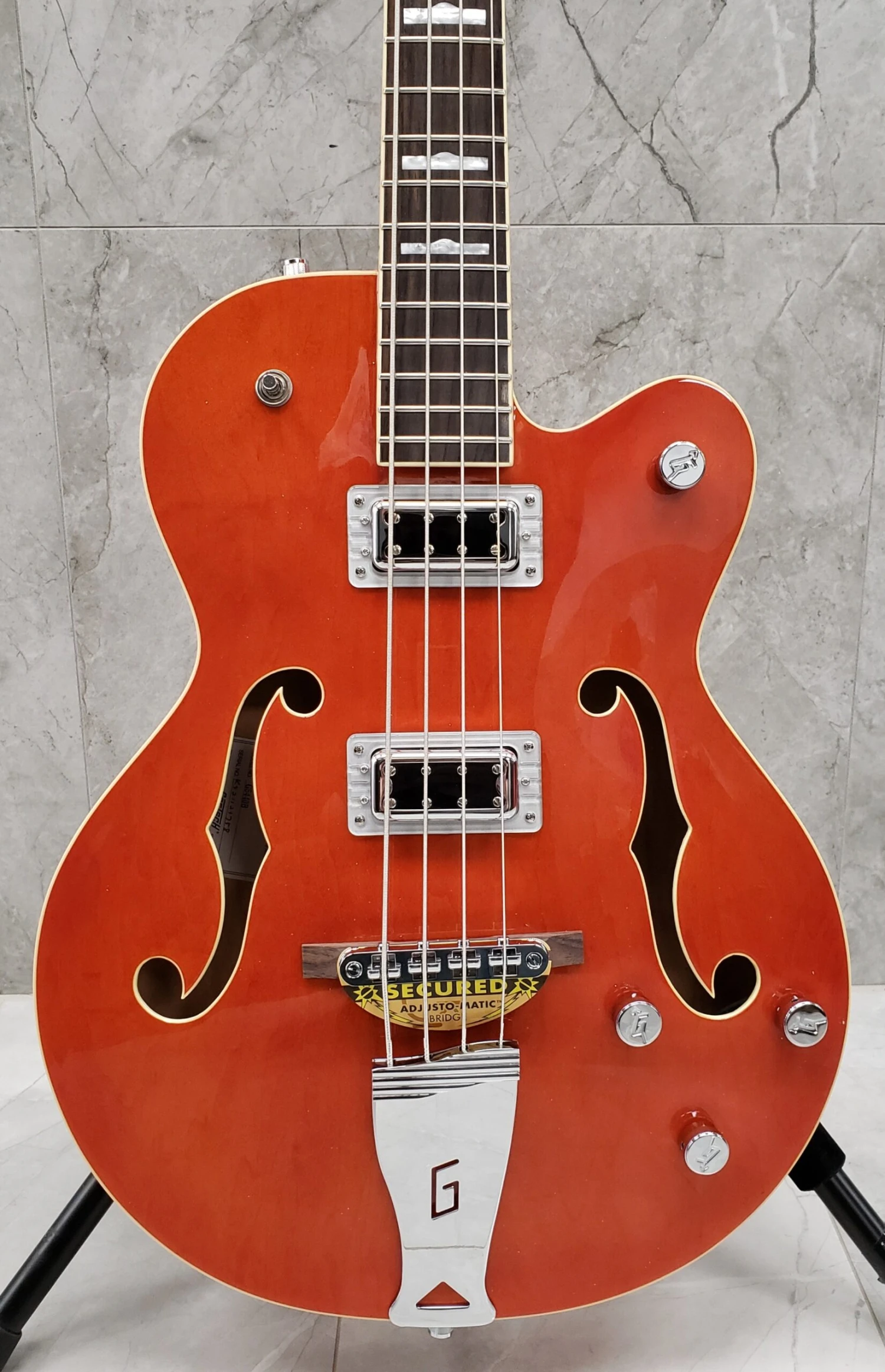 The G5440LS Electromatic Hollow Body Long-Scale Bass is a stylishly seismic new Gretsch bass guitar armed with two powerful new ñBlack Topî FilterÍTron» humbucking bass pickups that endow it with an electrifying deep-end voice and identity.