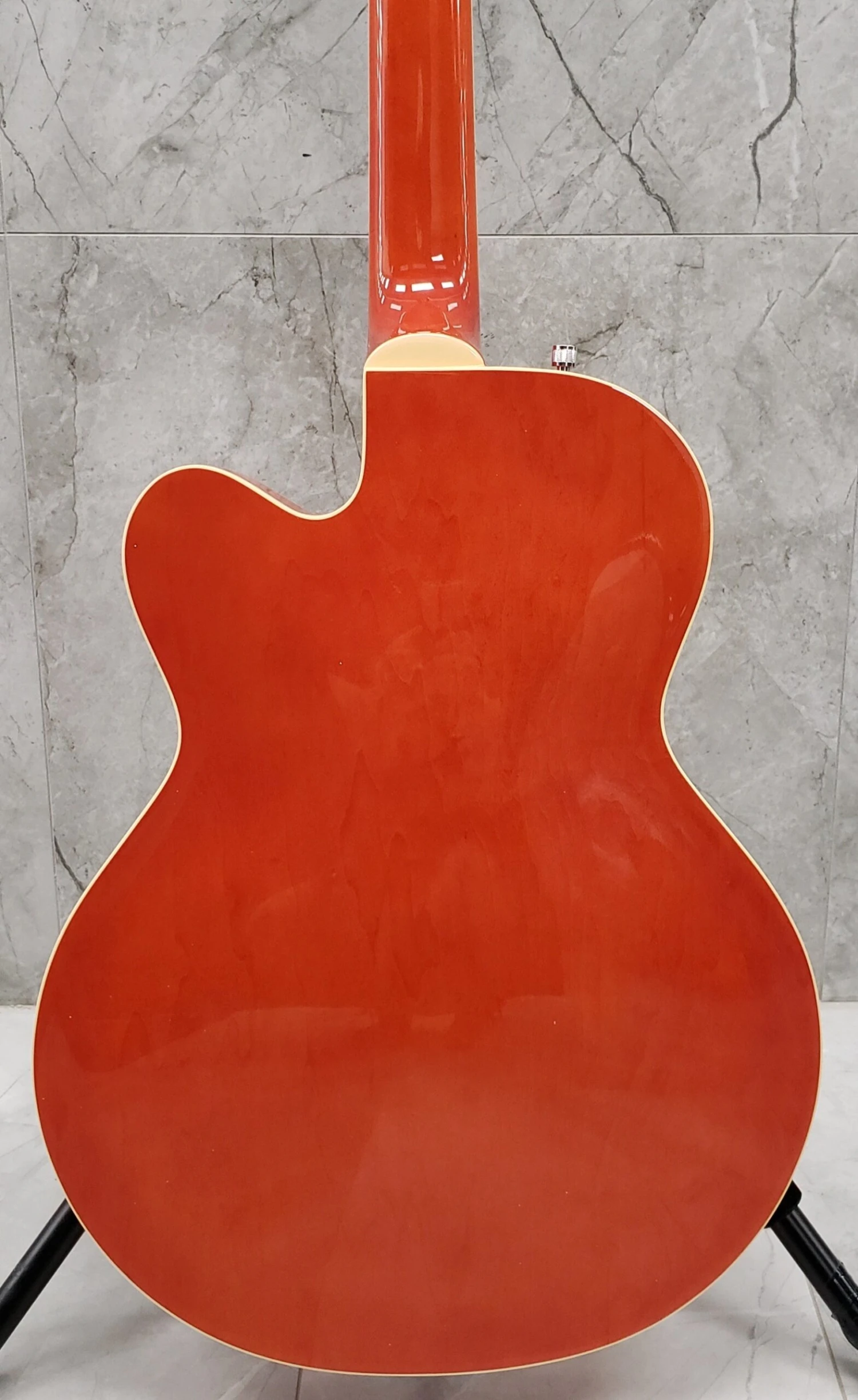 Hump-Block Fret Board Inlays, Bound Body Top and Back, Bound Sound Holes, Bound Fingerboard, Knurled Strap Retainer Knobs, Adjustable Truss Rod, “G” Cutout Tailpiece