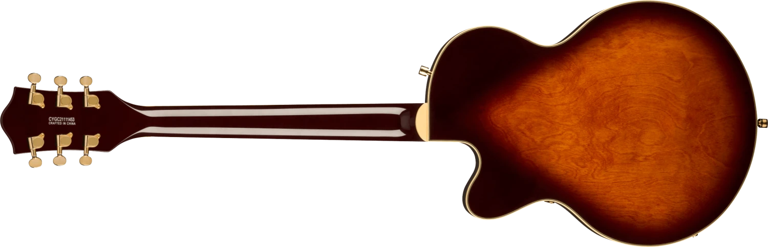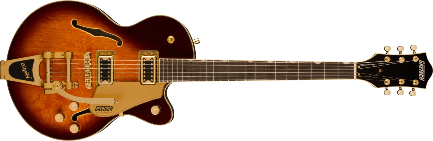 The G5655TG Electromatic® Center Block Jr. Single-Cut with Bigsby® and Gold Hardware features a smaller-sized body with a chambered spruce center block for dynamic resonance, high gain power and lightweight comfort.