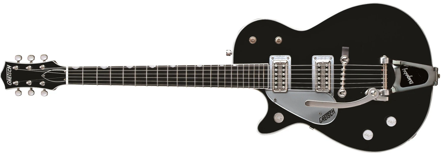 The classic Gretsch Duo Jet» dates to the earliest days of rock music. Modeled closely on its late-Í50s ancestor, todayÍs Duo Jet features dual High Sensitive FilterÍTron» humbucking pickups, ñtone switchî circuitry, ebony fingerboard with Neo-Classic» “thumbnail” inlays, Space Control» bridge and Gretsch by Bigsby B3C vibrato tailpiece.
