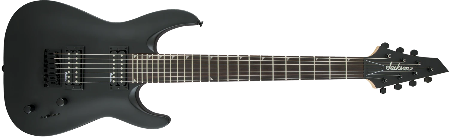 Powered by direct mount dual Jackson high-output humbucking pickups, the JS22-7 DKA HT is also equipped with a three-way blade switch, single volume and tone controls, compensated string-through-body fixed Jackson HT7 bridge, sealed die-cast tuners and our 3×4 (3 over, 4 under) AT-1 headstock.