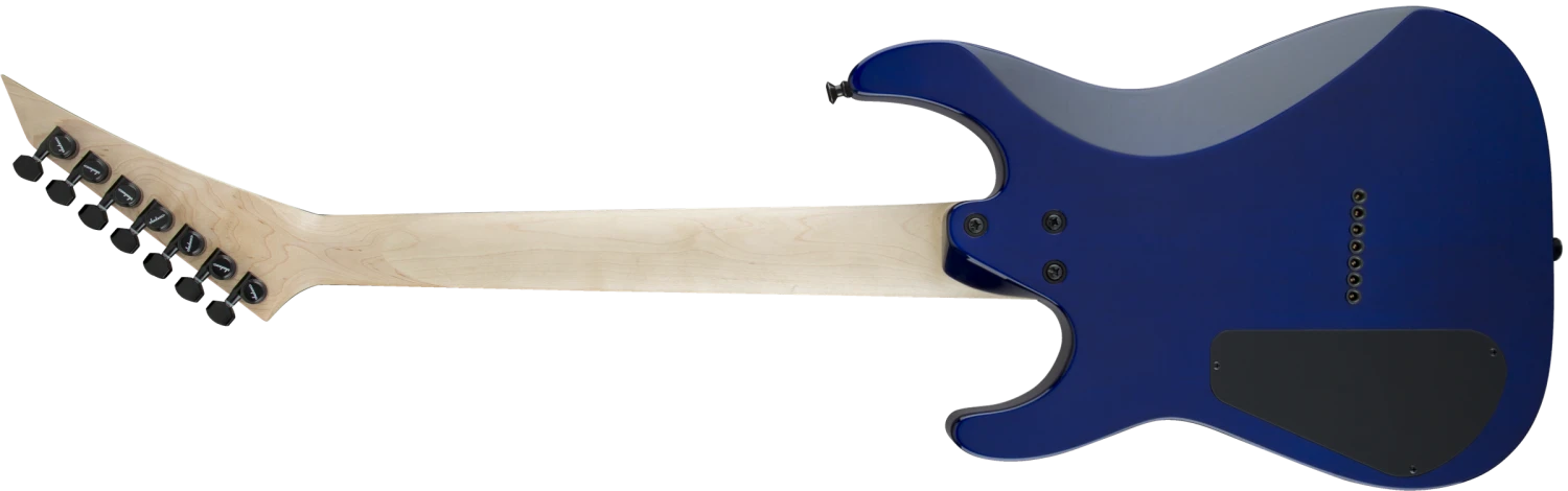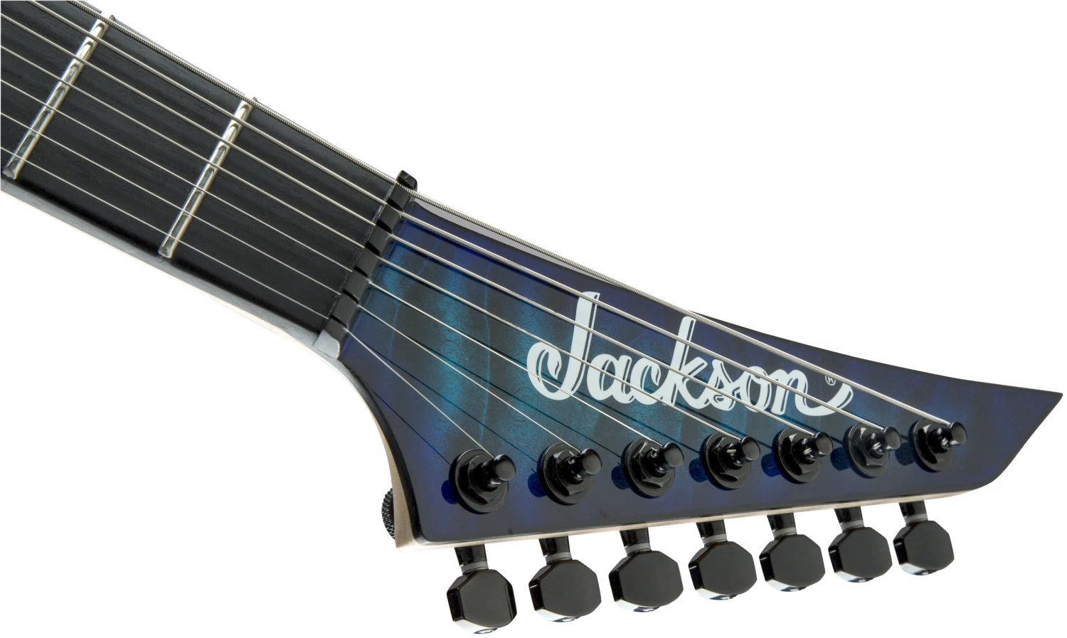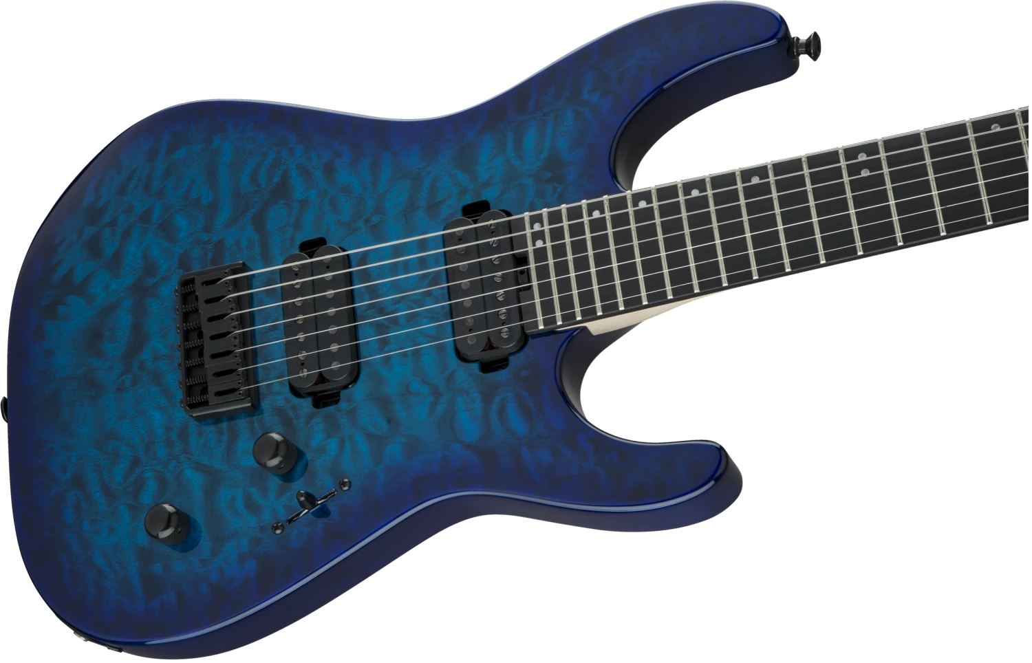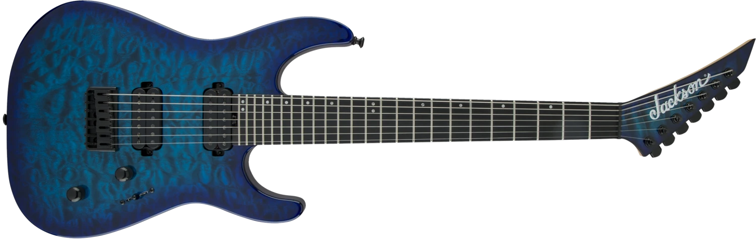 The 25.5”-scale 7-string DK7Q HT has an alder body with quilt maple top, bolt-on maple neck with smooth hand-rubbed urethane gel finish and rock-solid graphite reinforcement, 12”-16” compound radius fully bound ebony fingerboard with 24 jumbo frets and offset dot inlays, an ultra-convenient thumbwheel truss rod butt adjust and 7-in-line Jackson reverse headstock.