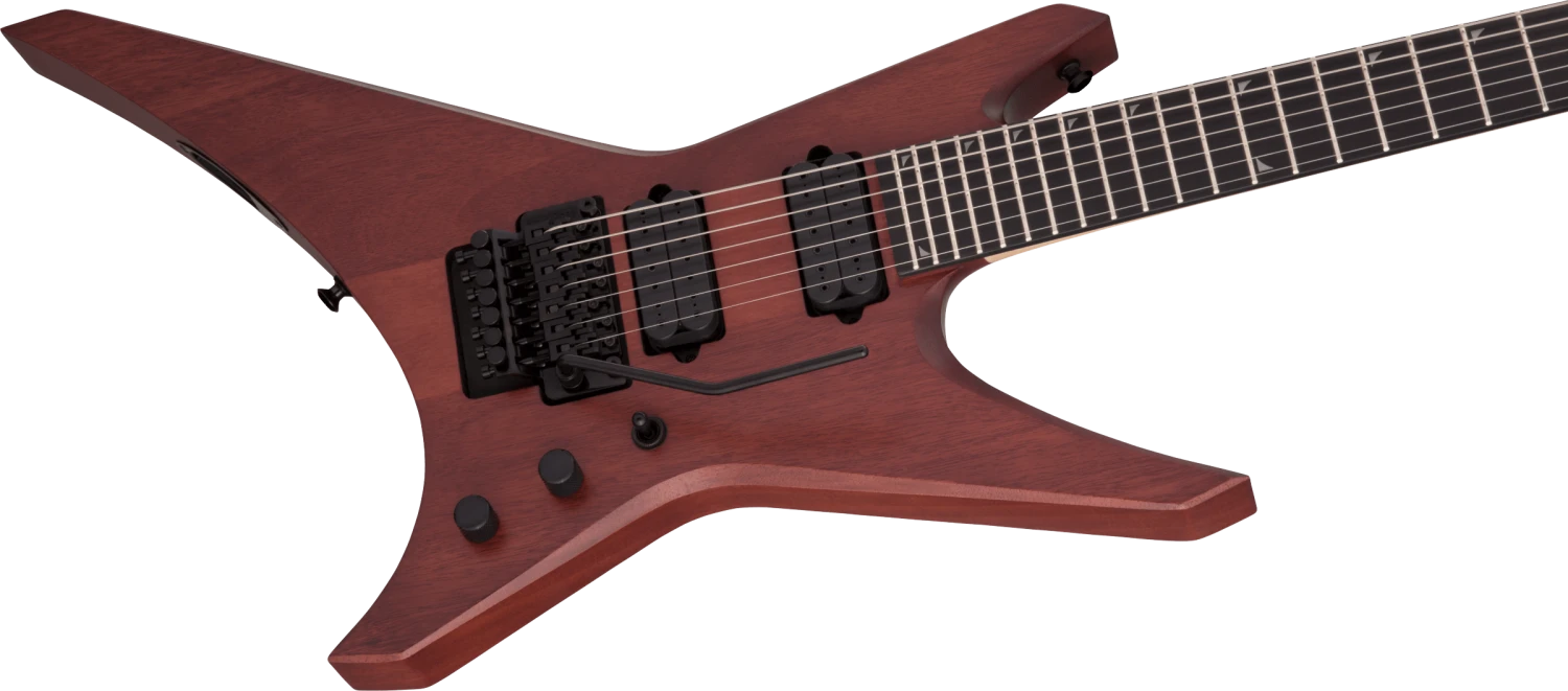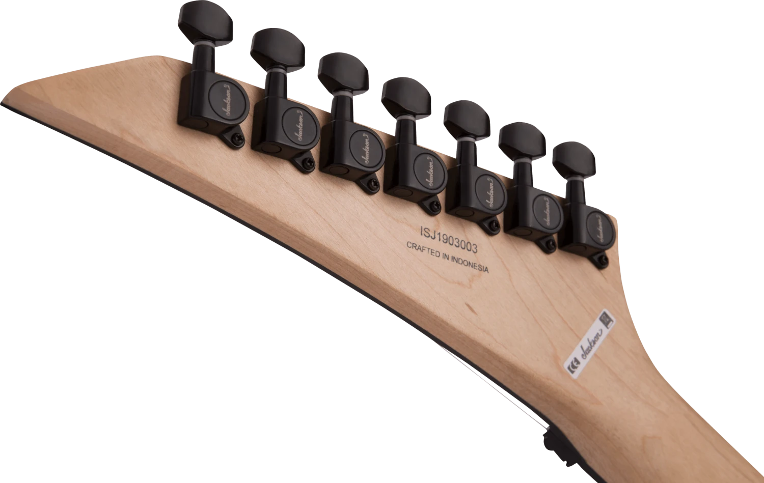 Davidson’s take on Jackson’s revered angular shape is in a 7-string form featuring a 25.5” scale length, mahogany body and through-body maple neck with scarf joint and graphite reinforcement for the utmost stability against the rigors and ravages of the road. The oiled finish on the back of the neck allows for a smooth playing feel, while its 12”-16” compound radius ebony fingerboard with 24 jumbo frets is designed for highly technical lightspeed playing—more curved by the nut for comfortable chording, it flattens out as you move up the neck for increasingly fast playing speed and wide bends without fretting out.