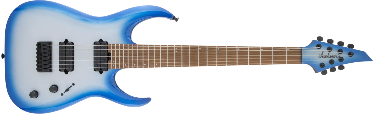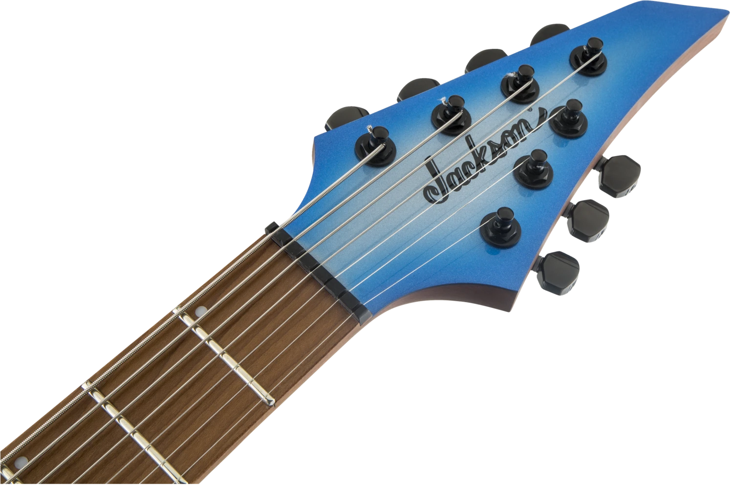 Available in Neon Orange or Blue Sky Burst with a matching Jackson 4×3 AT-1 headstock, this sig axe also features a Jackson HT7 string-through-body hardtail bridge, die-cast locking tuners and black hardware.