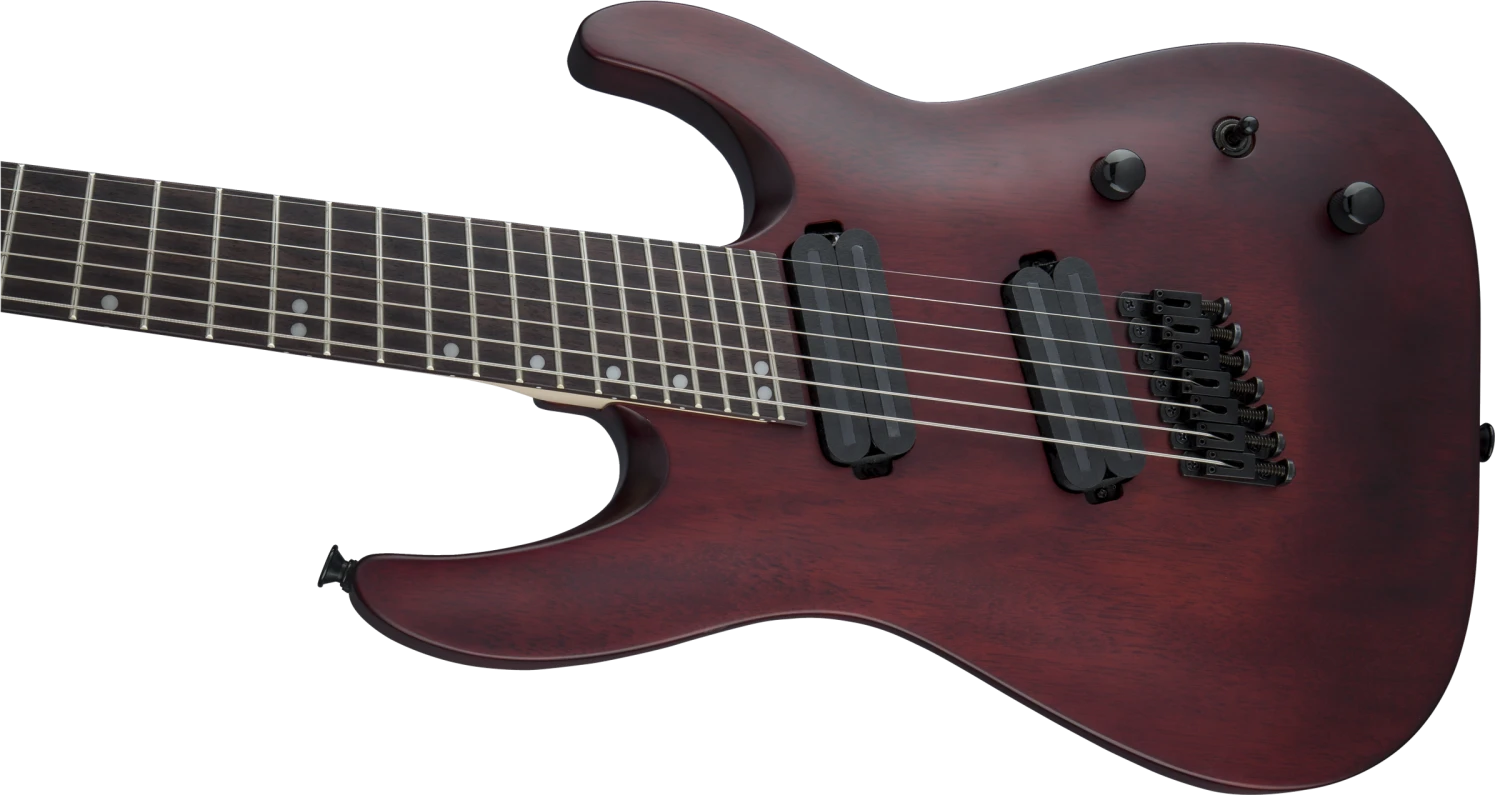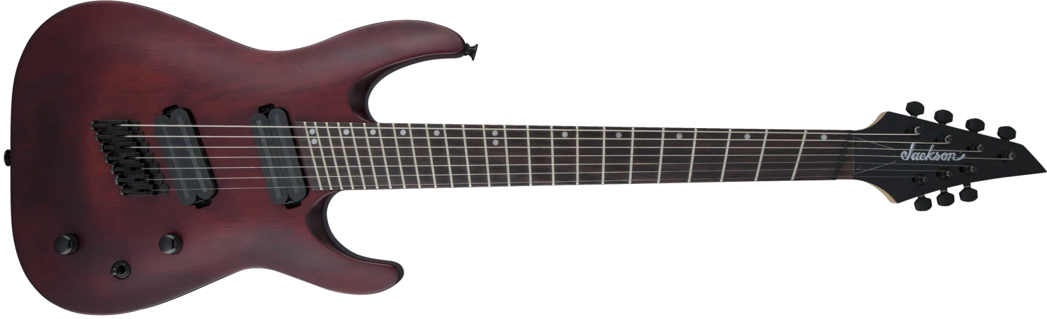 The DKAF7 features a 25.5″-27″ multi-scale length, mahogany body with an arched top, one-piece bolt-on maple neck with graphite reinforcement and scarf joint, 12″-16″ compound radius fingerboard with 24 jumbo frets and offset dot inlays, Jackson die-cast tuners and 4×3 AT-1 headstock.