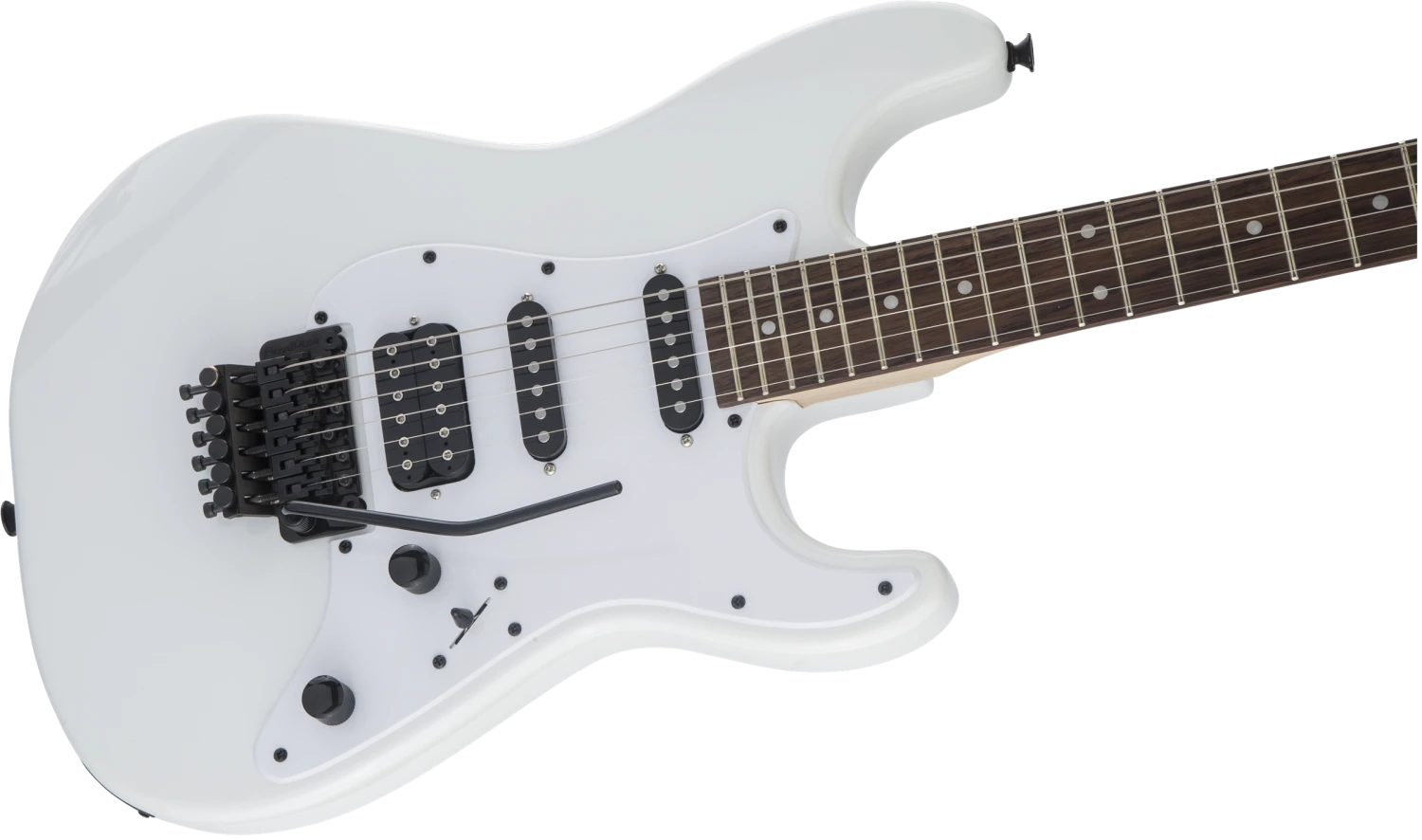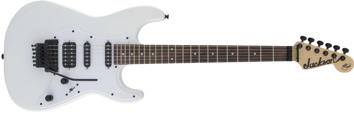 The affordable X Series Signature Adrian Smith SDX features a basswood body, bolt-on maple neck, compound-radius rosewood or maple fingerboard, HSS configuration (high-output Jackson bridge pickup, Jackson standard middle and neck single-coil pickups), white pickguard (laurel fingerboard model) or black pickguard (maple fingerboard model), five-way blade selector switch, Jackson tuners, Floyd Rose® Special tremolo system and black hardware.