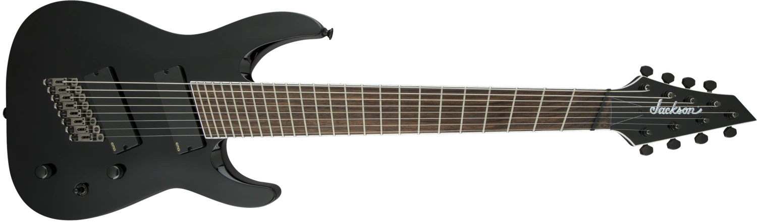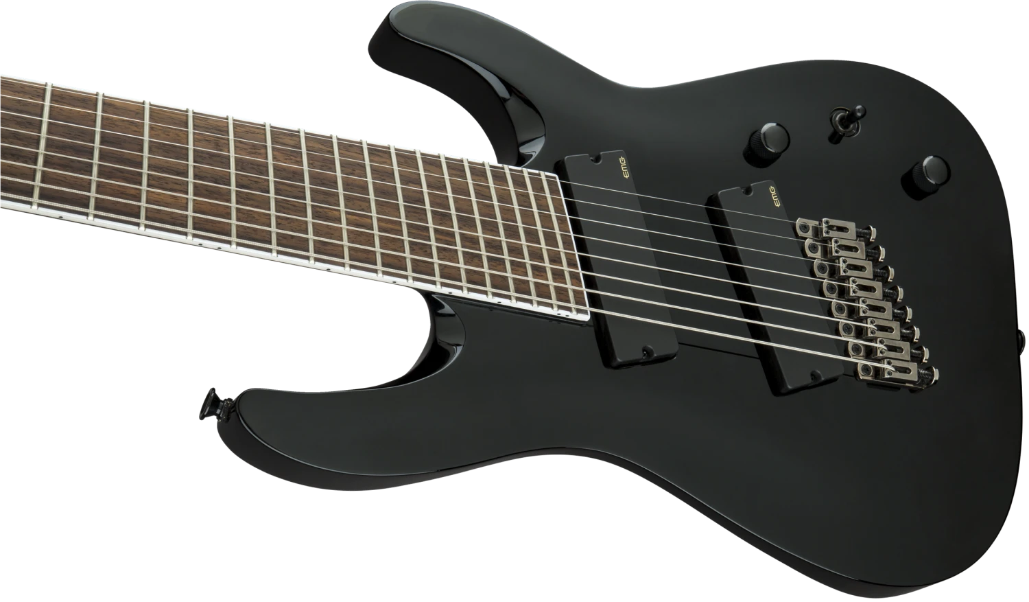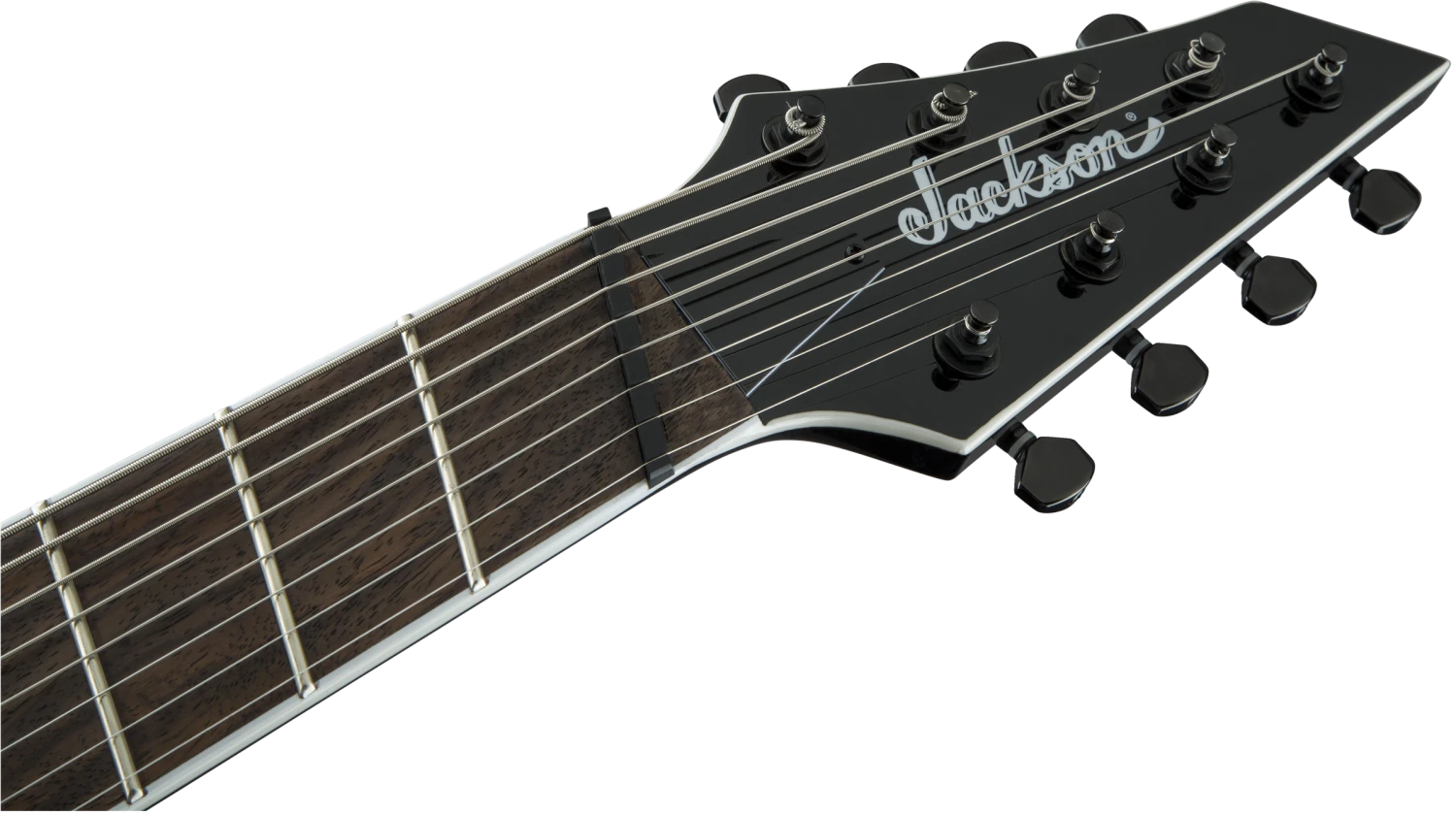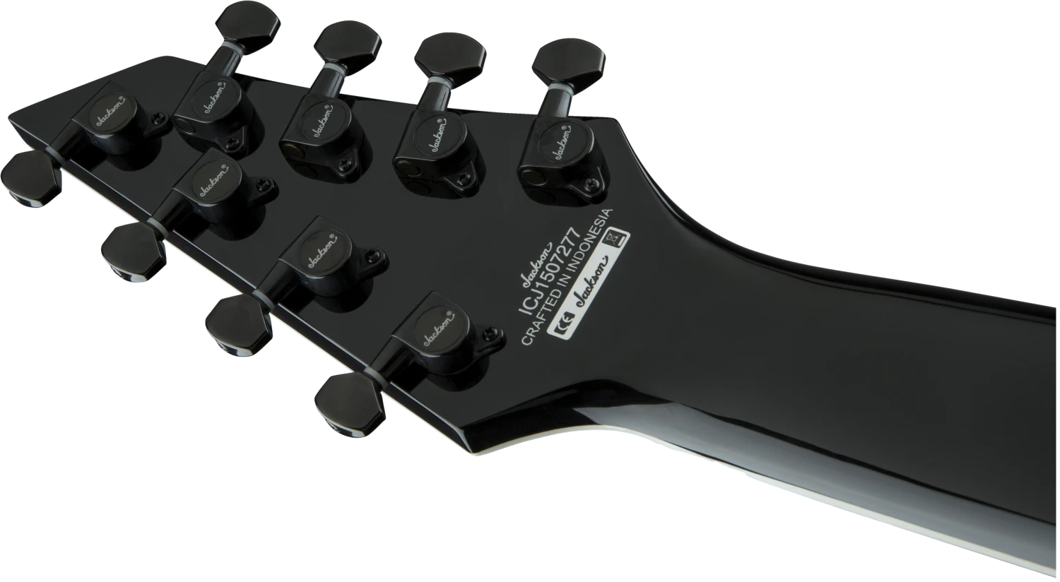 The SLAT8 MS features an arched top basswood body with a one-piece maple neck and scarf joint reinforced with two graphite rods for maximum neck stability, 12”-16” compound radius rosewood fingerboard with 24 jumbo frets, single-ply bound neck and Jackson 4×4 AT1 headstock with Jackson die-cast tuners.