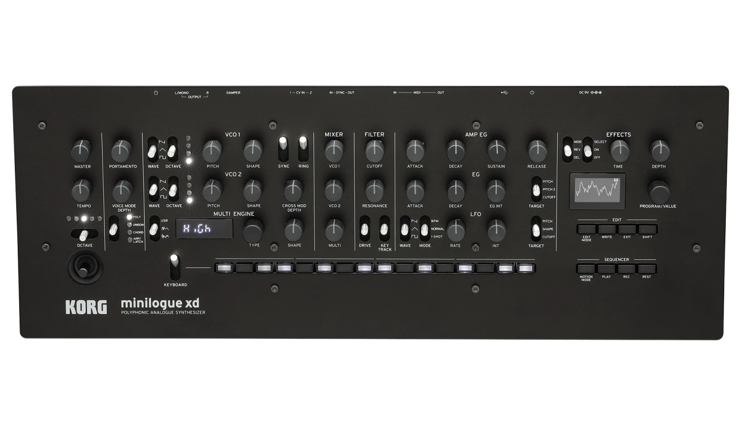 The long-awaited desktop module of KORG’s next-generation analog synthesizer. Minilogue xd module is the new desktop module version of minilogue xd, the four-voice polyphonic analog synthesizer with a customizable digital multi-engine and built-in stereo digital effects. The desktop module is equipped with the same controllers as the keyboard version, making it a great choice not only as an additional sound module for your keyboard or DAW but also providing excellent performability, giving you an easy way to include an analog polyphonic synth in your setup. It’s also equipped with a poly-chain function that lets you connect it with another minilogue xd or minilogue xd module so that the two units can operate as a polysynth with a total of up to eight voices in your studio or on stage. Add the sounds of the minilogue xd to your setup or system! Equipped with an analog synthesizer circuit and a digital multi-engine Voice structure of minilogue xd is 2VCO + MULTI ENGINE, 1VCF, 2EG, 1VCA, and 1LFO. In addition to the distinctive circuits found in the series, such as wave shaping to shape the overtones of the oscillator and a sync/ring switch, there’s also cross modulation, a two-pole filter that can be both sharp and fat, and a drive switch that adds thickness and drives signal into minilogue xd’s filter. Every parameter has been tuned in detail based on what musicians want out of their synth. The sounds range from the warm pads typical of analog to fat basses and crisp lead sounds, covering every situation.