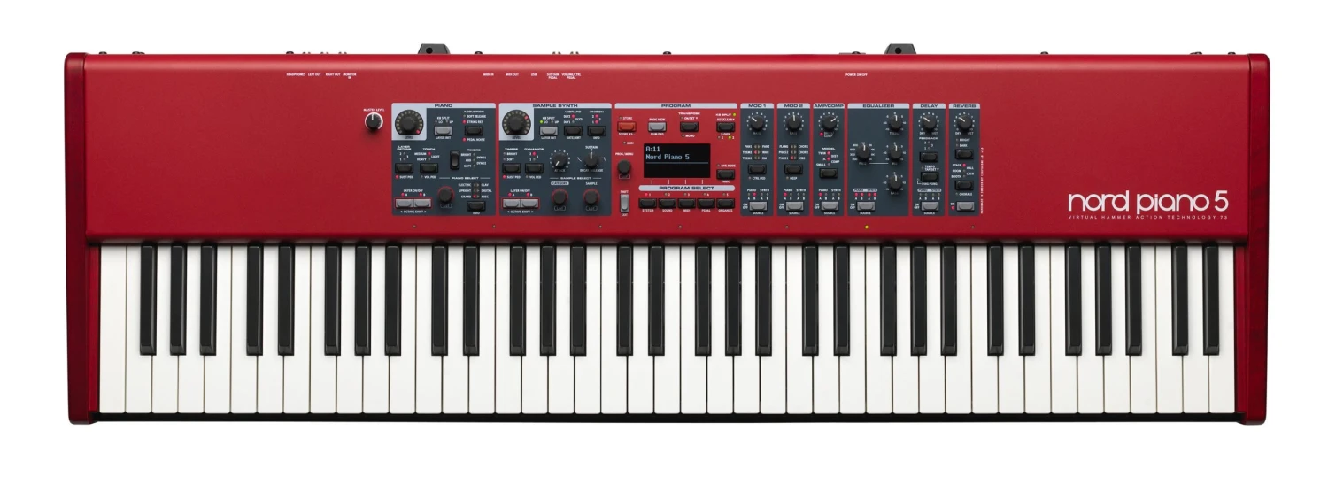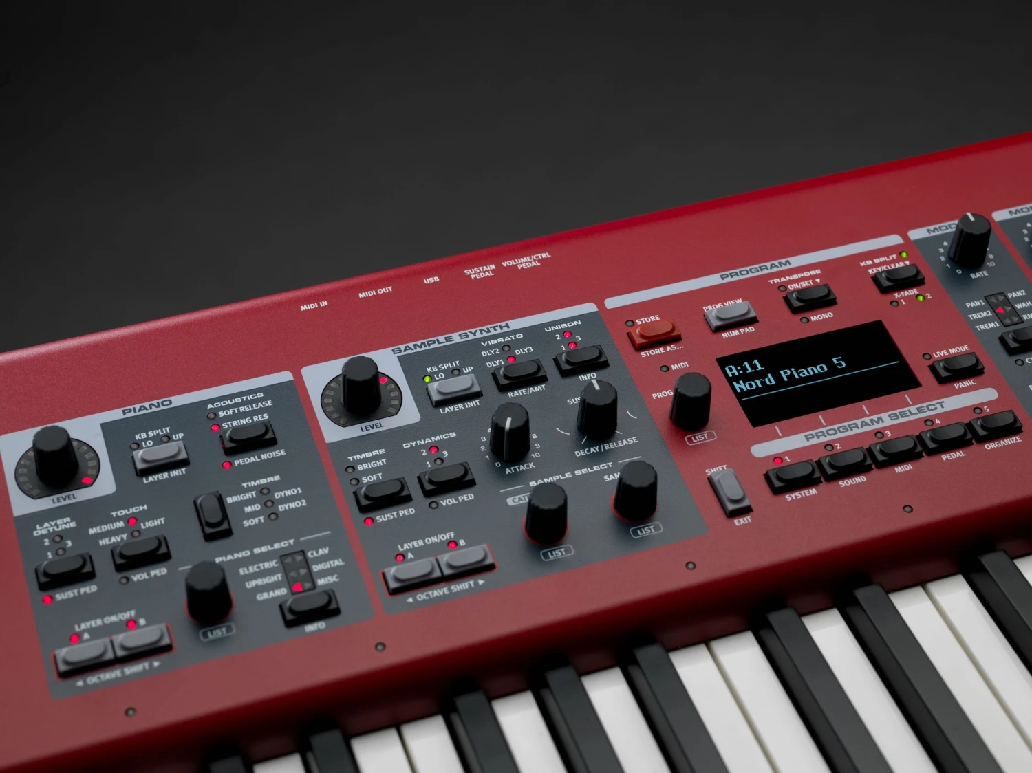 The latest edition of our award-winning Piano series is equipped with dual piano engines, dual sample synths and twice the memory of the previous generation. With the combination of a premium Triple Sensor keybed and our exclusive Virtual Hammer Action Technology, the portable Nord Piano 5 delivers an exceptional playing experience. Two independent Pianos and Sample Synths The Piano and Sample Synth sections of the Nord Piano 5 each contain two independent Layers. The two Pianos and two Sample Synths can be used simultaneously in a variety of split or Layer configurations. Combined with the versatile effects routing, a wide range of combinations can be achieved – from classic ensemble settings to rich soundscapes. The LED equipped Level controls allow for quick and precise balancing of all Layer volume levels. A Volume Pedal and/or Sustain Pedal can be assigned to each Layer. Live focused design The Nord Piano 5 has dedicated dials and buttons for full hands-on control during a live performance. Transposing, setting up a split point or creating a layered sound can be accomplished instantly. Seamless Transitions The Nord Piano 5 features seamless transitions for glitch free changing of sounds or programs while playing.