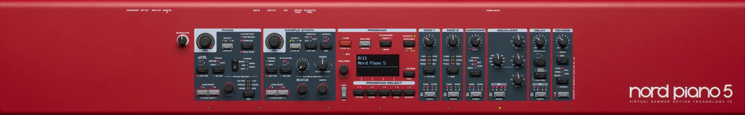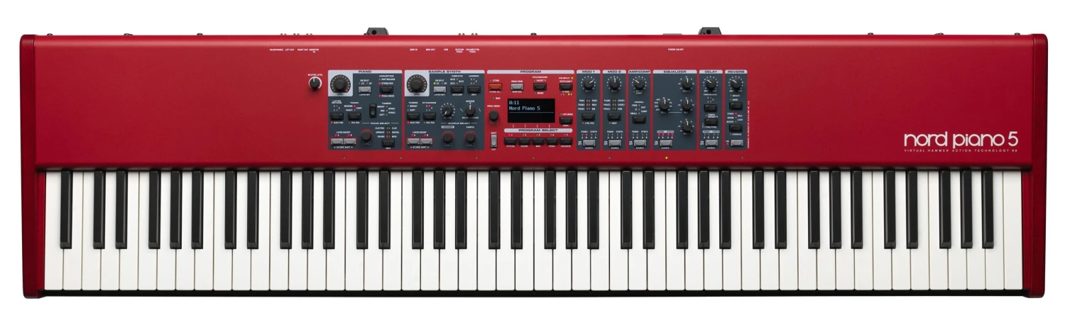 The latest edition of our award-winning Piano series is equipped with dual piano engines, dual sample synths and twice the memory of the previous generation. With the combination of a premium Triple Sensor keybed and our exclusive Virtual Hammer Action Technology, the portable Nord Piano 5 delivers an exceptional playing experience. Two independent Pianos and Sample Synths The Piano and Sample Synth sections of the Nord Piano 5 each contain two independent Layers. The two Pianos and two Sample Synths can be used simultaneously in a variety of split or Layer configurations. Combined with the versatile effects routing, a wide range of combinations can be achieved – from classic ensemble settings to rich soundscapes. The LED equipped Level controls allow for quick and precise balancing of all Layer volume levels. A Volume Pedal and/or Sustain Pedal can be assigned to each Layer. Live focused design The Nord Piano 5 has dedicated dials and buttons for full hands-on control during a live performance. Transposing, setting up a split point or creating a layered sound can be accomplished instantly. Seamless Transitions The Nord Piano 5 features seamless transitions for glitch free changing of sounds or programs while playing.