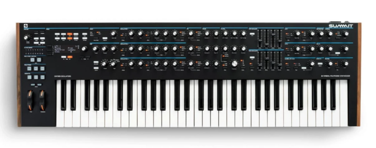 Built on the innovative foundations of Novation’s critically acclaimed Peak, Summit is a three-oscillator-per-voice, 16-voice keyboard synth aimed at the professional or semi-professional musician seeking an inspiring, empowering instrument for use both live and in the studio. In fact, Summit effectively puts the power of two Peaks at your fingertips, enabling two completely independent patches to be split or layered across the keyboard, or switched between on the fly. It also expands on Peak’s layout, with many ‘hidden’ controls and functions made accessible on the front panel – FM routing, LFOs 3 and 4, all arpeggiator parameters and more – plus the addition of pitch and mod wheels. Summit also features numerous new filter options, and an audio input for processing external sources with its reverb, chorus and delay effects. At the heart of Summit are three digital New Oxford Oscillators per voice, hosted on the FPGA (Field Programmable Gate Array) chip. As well as generating authentic analogue-style waveforms at incredibly high resolution, this also facilitates FM and wavetable synthesis for the design of rich, complex and highly textural raw tones. Each voice feeds into a true stereo signal path comprising dual analogue filters, three stages of analogue distortion and analogue VCAs; while a wealth of modulation assignment options and three colourful effects bring movement, life and polish to your patches.