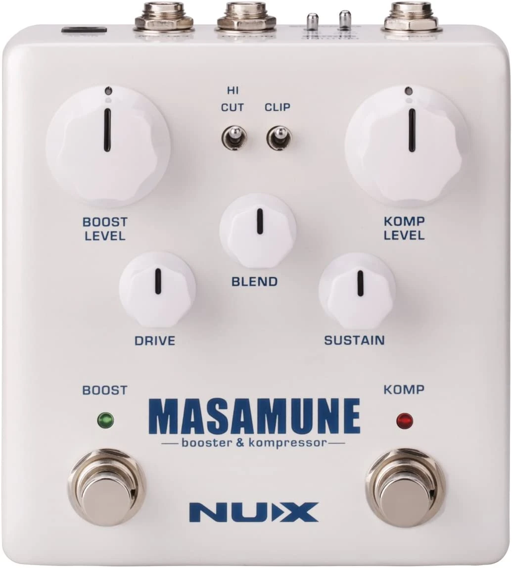 Booster and Compressor Pedals are the gigging guitarist’s secret weapon. Both pedals are now available in one convenient metal housing, and it comes with selectable signal routing. The Boost Section comes with Boost Level, Drive, and Hi-Cut controls. The Compressor Section comes with Komp Level, Sustain, Blend, and Clip controls. The Masamune has an external foot-switch jack Input, you can easily operate the pedal by using an additional remote switch. NUX Masamune is a sound-crafter pedal It forges your dry-signal, enhancing your sound before sending your signal to your amp, and/or any effects unit. The Booster adds beneficial color to your signal, and, if necessary, after you adjust the boost & drive levels, you can cut high frequencies on your Input signal with the Hi-Cut Toggle Switch. Masamune’s Kompressor does a remarkable job managing and enhancing your signal: Komp Level knob adjusts the final Output level for the Compressor, perfectly balancing your Input and Output signals. Sustain knob adjusts the compression ratio, and increases sustain. Higher sustain levels will squash your signal harder when you hit the strings and creates a longer, richer sustain. Blend knob adjusts the compressor transparency from 50% to 100%, so you can dial-in the exact amount of compressed dry-signal blend you want. Clip Toggle allows you to choose the clipping range of your Input signal. The Toggle-UP position will squeeze the signal for voluminous sound, and Toggle-DOWN will open up more space on your clipping range. Inside Routing NUX Masamune Booster & Kompressor has inside routing with 3 Functions: – Use both effects in parallel connection. – Toggle-UP the MUTEX to engage only one effect at a time. – Choose which effect you want to come first on your signal chain.