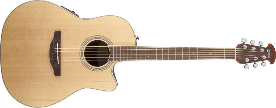 Ovation Celebrity® Standard, Mid-Depth Cutaway, Natural CS24-4_140237 The Celebrity Standard series is your first step into the world of O6 String AcousticAcvation, with first-rate sound, style, features and value. The Celebrity Standard CS24-4 guitar has the classic mid-depth Lyrachord cutaway body with a solid spruce top featuring quartersawn scalloped “X” bracing. We reviewed earlier Ovation bracing patterns extensively to arrive at this remarkable new design, which borrows from the past and is voiced for the present with natural tone and optimal response and power. Together, body and top create the classic Ovation sound, resonating with full projection, remarkable note clarity and balance, and nuanced tonal complexity. The spruce top also has an elegant pearloid rosette, ivory white binding and beautiful Natural gloss finish. Other premium features include an effortlessly playable neck with a natural satin finish and rosewood-veneer headstock, 20-fret bound rosewood fretboard with pearloid microdot inlays, and a rosewood bridge. For great live sound, the CS24-4 features an Ovation Slimline pickup and OP-4BT preamp system with three-band EQ, volume/ gain control, onboard tuner and low-battery light.