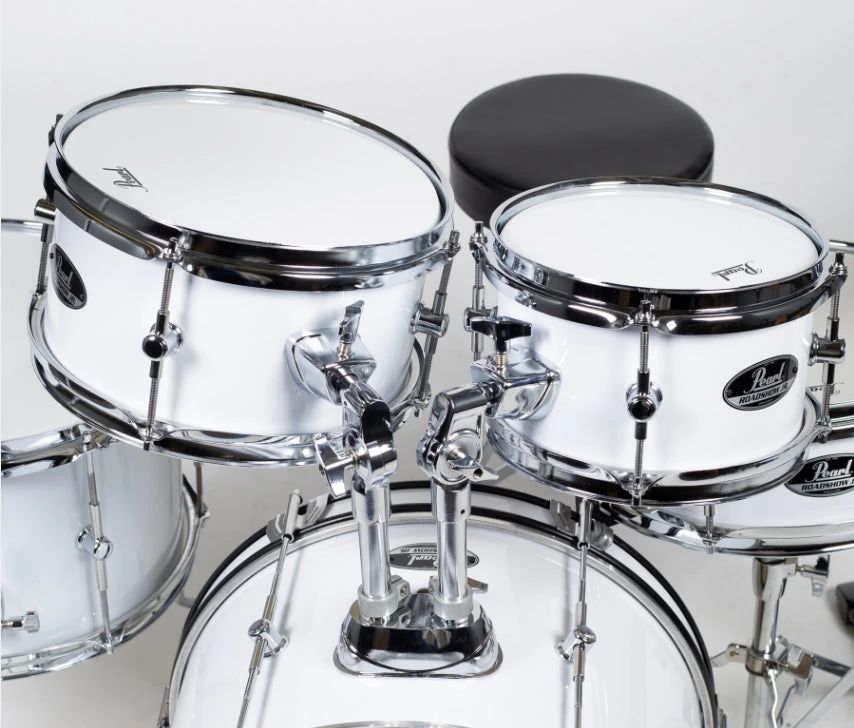 Following in the footsteps of Pearl’s Roadshow series for beginning drummers, the all new Roadshow Jr. is a complete drum set package scaled-down to best fit smaller drummers 10 years old and under. This all-in-one five piece kit features sturdy drum hardware, cymbals, and quality White Poplar shell construction for a totally tuneable, powerful playing experience. Featuring a 16″x10″ bass drum, a 13″x8″ floor tom, 10″x5.5 and 8″x5″ toms, and 12″x4″ snare drum, Pearl’s new Roadshow Jr. proves it’s never too soon to start the journey of rhythm!