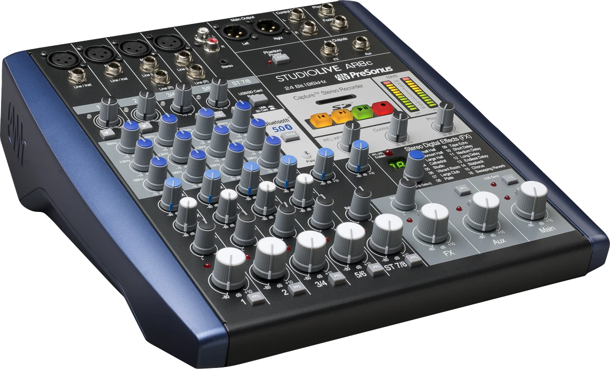 With its instantly familiar analog mixer design, the StudioLive® AR8c is the easiest way to record podcasts, livestreams, and music productions. Featuring a pristine analog front end with four high-gain XMAX mic preamps and an 8×4, 24-bit, 96 kHz, USB-C™-compatible USB 2.0 audio interface, the StudioLive AR8c’s hybrid design makes it simple to mix and record. Add in tools like a musical 3-band analog EQ, mic/line boost for low-level input sources and consumer devices, Bluetooth® connectivity, a stereo SD recorder, and high-impedance instruments inputs, and you have a broadcasting and recording powerhouse that fulfills the needs of modern musicians and content creators.