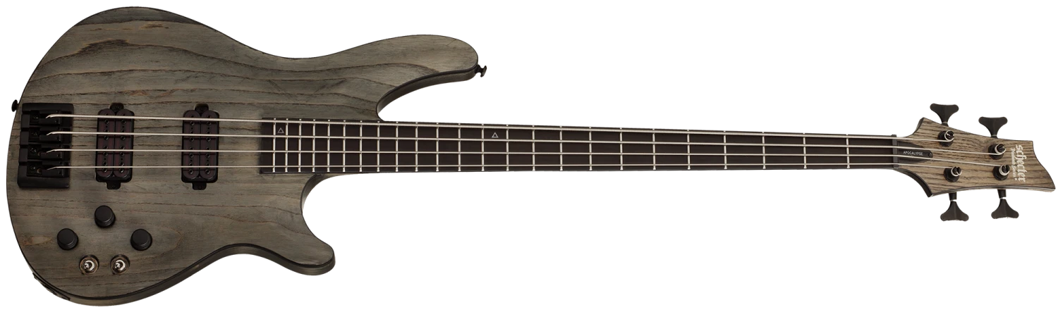 Country of OriginSouth Korea Guitar Color ShownRusty Grey (RG) Neck TunersGrover FretboardEbony Neck MaterialMaple/Padauk Multi-ply w/Carbon Fiber Reinforcement Rods InlaysMother of Pearl Triangle at 12th & 24th Fret Side Dot MarkersGlow in the Dark Scale34” (863mm) Neck ShapeThin ‘C’ Thickness@ 1st Fret- .787” (20mm)/ @ 12th Fret- .866” (22mm) Frets24 X-Jumbo Stainless Steel Fretboard Radius16” (406mm) NutGraph Tech XL Black Tusq Nut Width1.496” (38mm) Truss Rod2-Way Adjustable Rod w/ 5/32” (4mm) Allen Nut Body Guitar ColorsRusty Grey (RG) Hardware ColorSatin Black Top ContourArched Top DexterityRight Handed ConstructionSet-Neck w/Ultra Access Body MaterialSwamp Ash BindingBlack 1-ply BridgeSchecter Custom Hardtail w/ String Thru Body Electronics ControlsVolume/Tone/3-Way Switch/3-Way Series-Split-Parallel Pickup Switches Bridge PickupSchecter USA Apocalypse™ J-Bucker Neck PickupSchecter USA Apocalypse™ J-Bucker Accessories KnobsHipshot O-Ring StringsErnie Ball 4 String Super Long #2849 (.045-.105) CaseSGR-6B “Case Sold Separately”