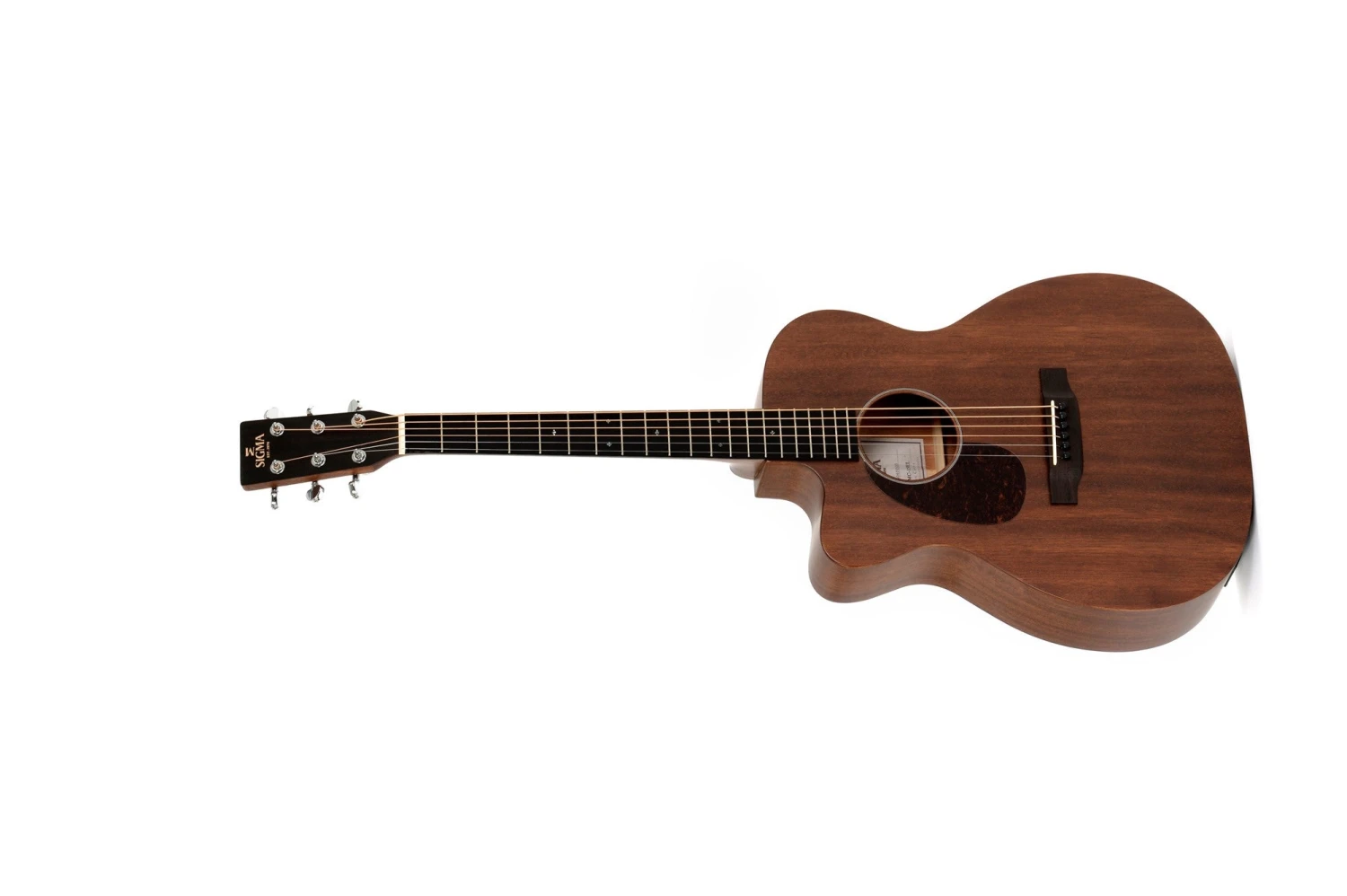 Left-handed cutaway, solid top, mahogany-bodied electro acoustic 000 size guitar.
