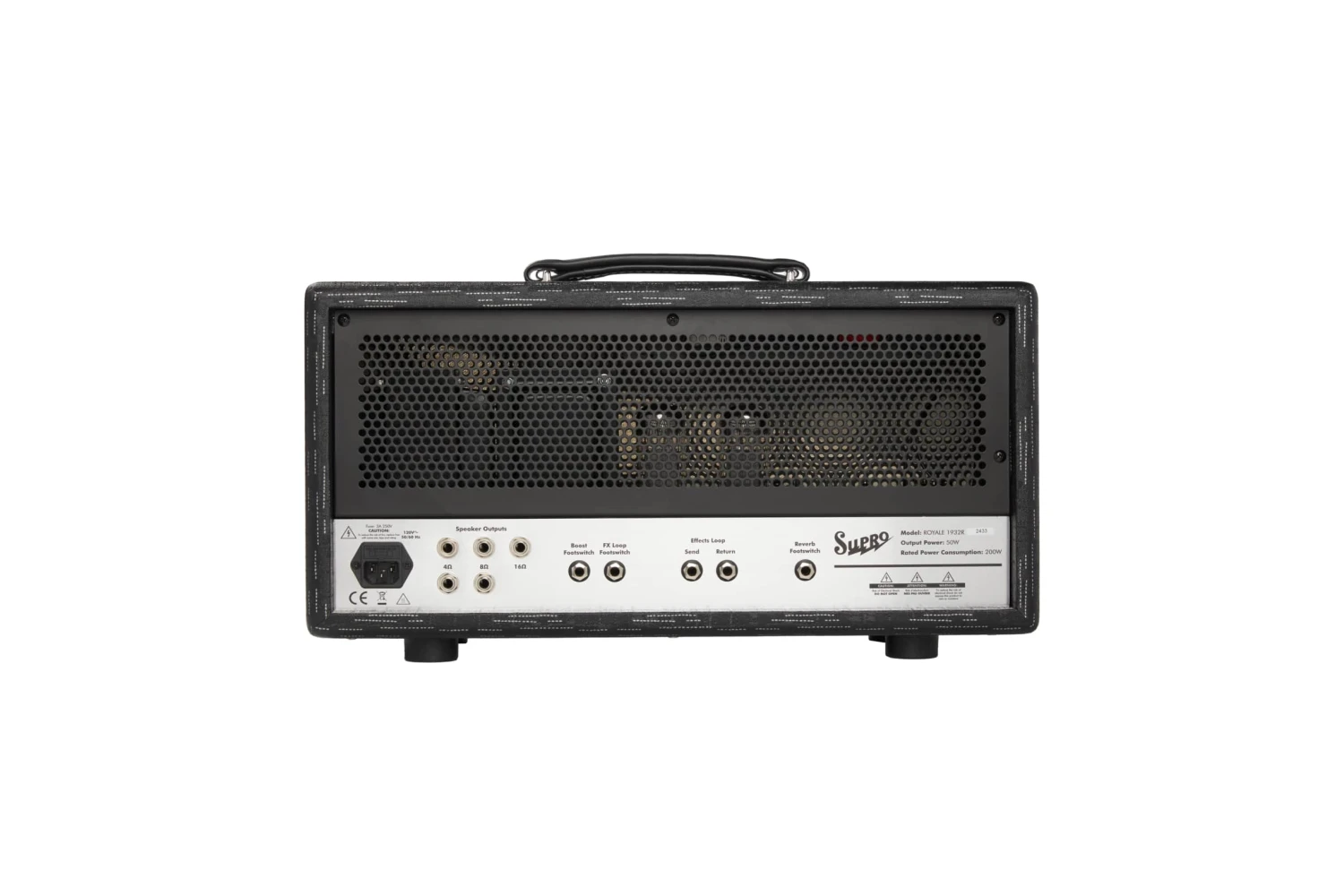A HEAD WITH HEADROOM! The Royale was designed to deliver loud and vivid clean tone with a remarkably responsive, tactile low end. A high-headroom, 50W tube amplifier with a powerful EQ, footswitchable boost, tube-buffered effects loop and glorious tube-driven spring reverb, the Royale captures all of the nuances in your playing, both on stage and in studio. The 5881-loaded power amp in the Royale offers a choice of Class A (35W) or Class AB (50W) operation, as well as a master volume to control sound pressure level. Class A mode delivers the traditional, cathode-biased Supro sound with a bold, spongy midrange. Class AB delivers a grid-biased California sound with more scooped mid-range, tighter bass and faster transient response. Housed in poplar cabinetry with vintage-inspired Black Scandia tolex and a hemp cloth accents, the Royale is Supro’s most dynamically responsive, feature-packed, high-headroom amplifier to date. Also available in combo format.