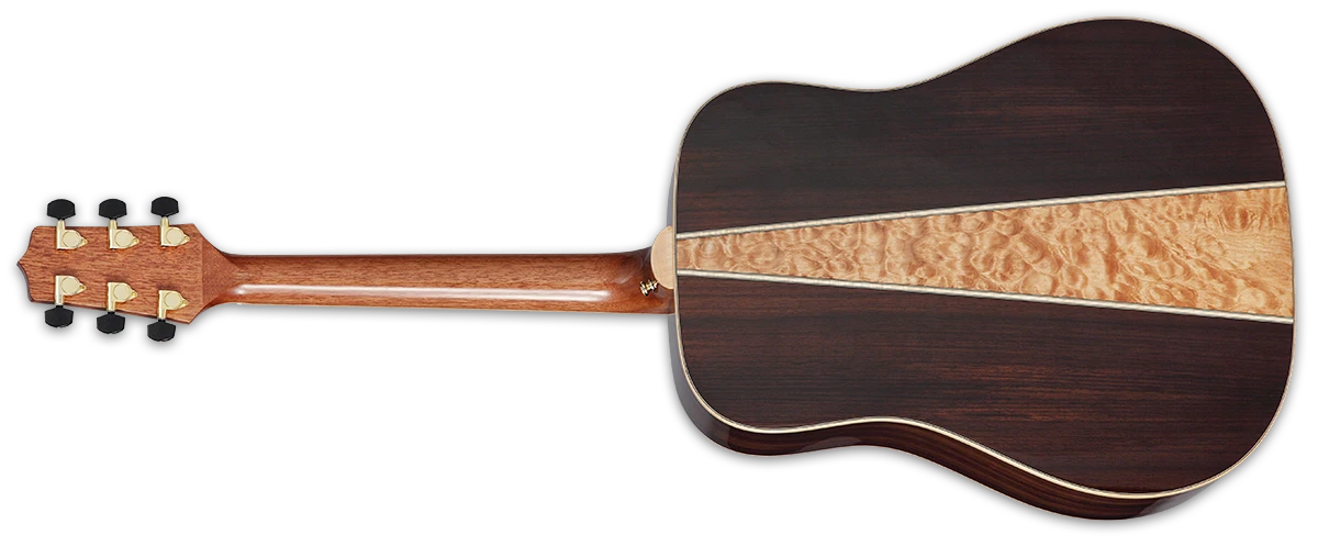 The GD93 is a dreadnought-style acoustic guitar with a refined and contemporary look that features a solid top and special back construction, giving it an upscale feel and distinctive sound. For players looking for something extra special, the GD93 features a solid spruce top, rosewood sides and a beautiful three-piece rosewood/quilt maple back. The slim mahogany neck and 12″-radius bound rosewood fingerboard provide great feel and playability, while the split-saddle design of the rosewood bridge provides superior intonation for sweeter-sounding chords and single-note runs. Other premium features include maple body, neck and headstock binding; dark wood rosette and body purfling; synthetic bone nut and bridge saddle; rosewood headcap; abalone dot inlays; gold die-cast tuners with black buttons; and a beautiful gloss finish. Available in Natural.