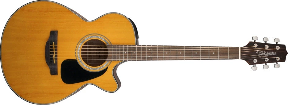 Takamine GF30CE-NAT FXC Cutaway Acoustic-Electric Guitar, Natural The GF30CE is a sleek-looking acoustic/electric guitar that features solid-top construction, superior-sounding electronics and Takamine’s diminutive FXC body style with a soft Venetian-style cutaway. A great choice for any player seeking the well-balanced sound of a small-bodied guitar, the GF30CE combines a solid spruce top with mahogany back and sides that produce notable sweetness and articulation. The slim mahogany neck and 12”-radius rosewood fingerboard provide great feel and playability, while the onboard Takamine TP-4TD preamp system gives you a built-in tuner with three-band EQ and gain controls for excellent amplified performance and versatility. Other great features include a pin-less rosewood bridge, synthetic bone nut and split bridge saddle, rosewood headcap, pearloid rosette and dot inlays, chrome die-cast tuners and a beautiful gloss finish. Available in Natural, Black and Sunburst. Features Series: G30 Series Color: Natural Body Body Finish: Gloss Body Shape: FXC Cutaway Bracing: Quartersawn “X” Body Back: Mahogany Body Sides: Mahogany Body Top: Solid Spruce Neck Neck Material: Mahogany Neck Finish: Satin Scale Length: 25.3″ (643 mm) Fingerboard: Rosewood Fingerboard Radius: 12″ (305 mm) Number of Frets: 20 String Nut: Synthetic Bone Nut Width: 1.6875″ (42.8 mm) Position Inlays: Pearloid Dot Electronics Special Electronics: Takamine TP-4TD Preamp with Built-In Tuner Hardware Bridge: Rosewood Hardware Finish: Chrome Tuning Machines: Chrome Die-Cast Miscellaneous Strings: D’Addario® EXP 16 Coated Phosphor Bronze (.012-.053 Gauges)